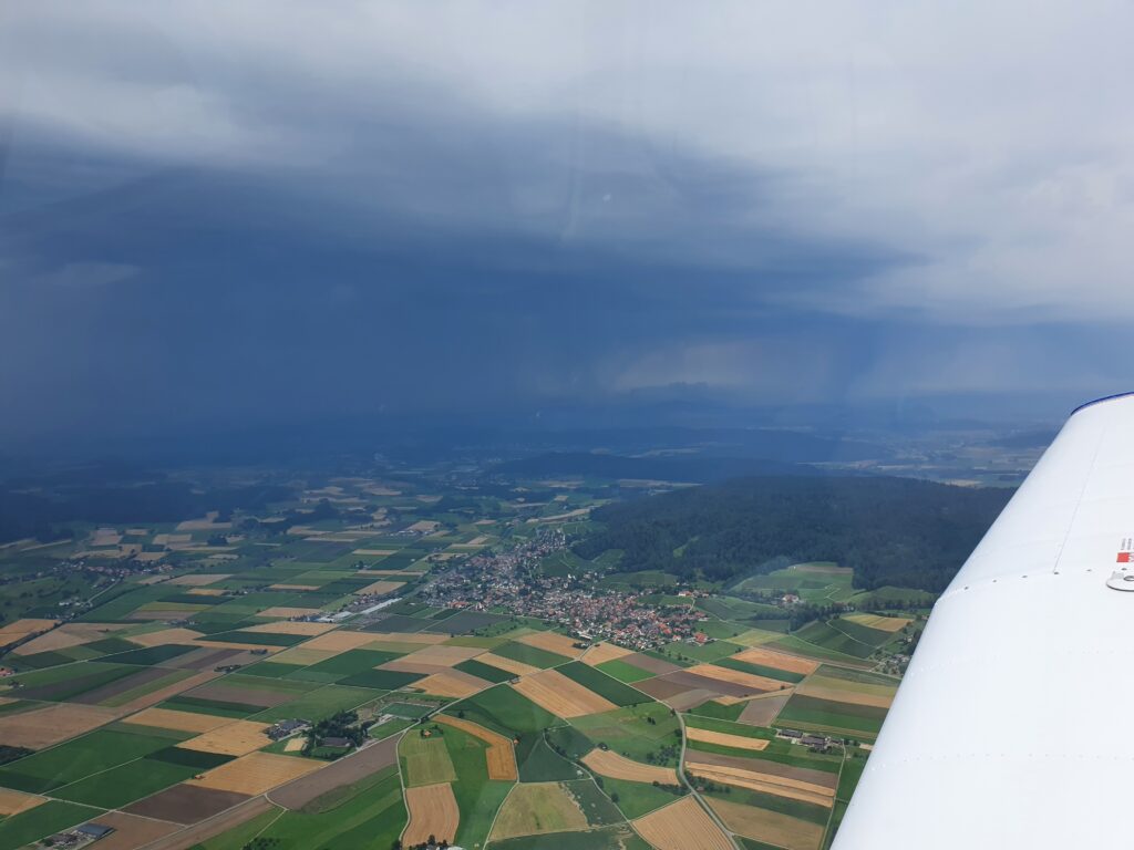 Die dunklen Gewitterwolken sahen wir erst in der Schweiz in Richtung Schaffhausen nach Nordost wegziehen. Dort machten wir noch einen kurzen „Wasch-Abstecher“, um im Regen noch ein paar Mücken und etwas Dreck von Flieger zu putzen und zugleich den Rheinfall zu sehen, bevor wir links Richtung Süden abdrehten und Birrfeld ansteuerten.