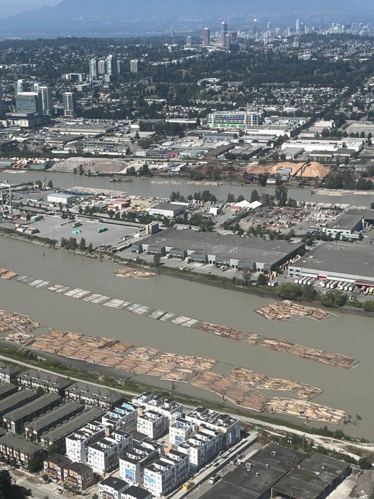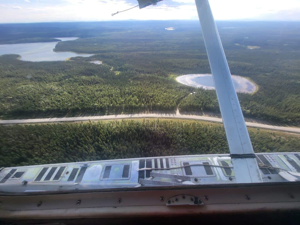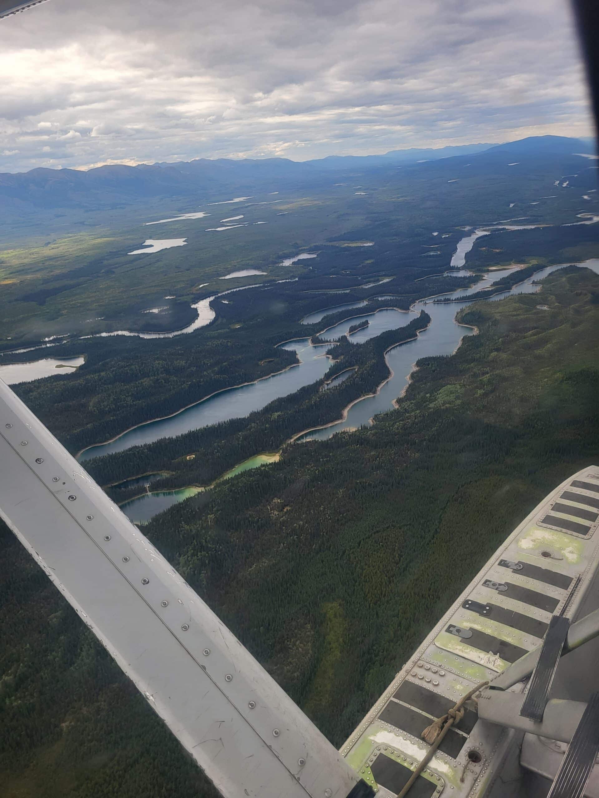 Nachdem alle gefühlt tausend Dinge im Flieger und in den Floats ihren Platz gefunden hatten (inkl. 28 Plywood-Platten), gab Séb uns die Schwimmwesten in die Hand und erläuterte die Sicherheitsanweisungen. Eigentlich wäre das nicht nötig, ist ja quasi unsere Heimstrecke. Ab sicher ist sicher. So tuckerten wir sicher informiert auf den See raus und kurz danach ratterten wir über die kleinen Wellen in Richtung Norden. Einmal quer über den Flugplatz und dann immer weiter ging der Flug, Ziel Rosie Lake.