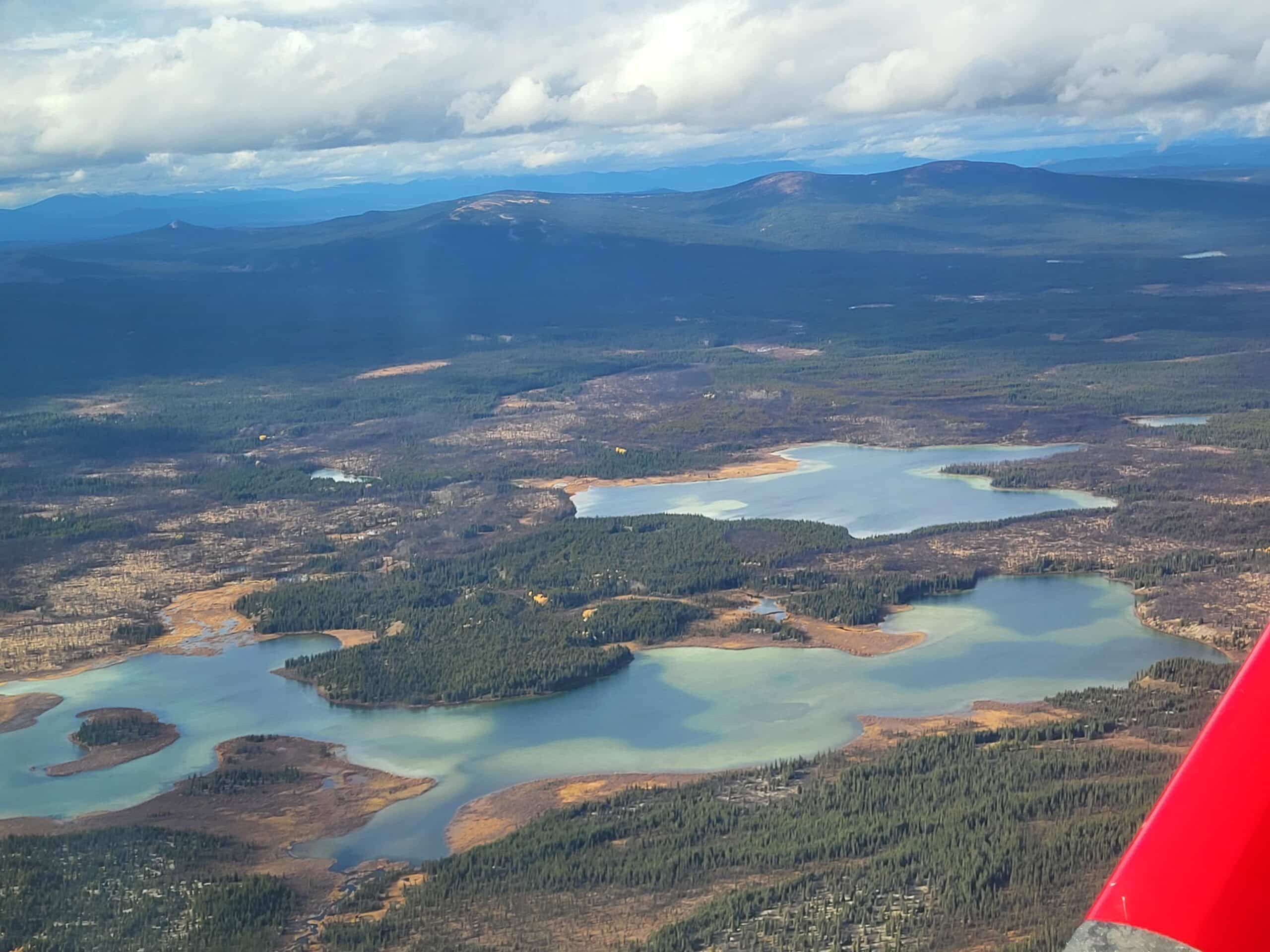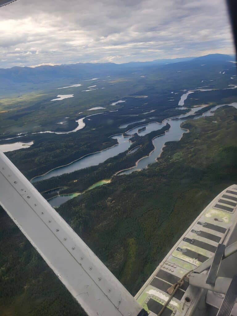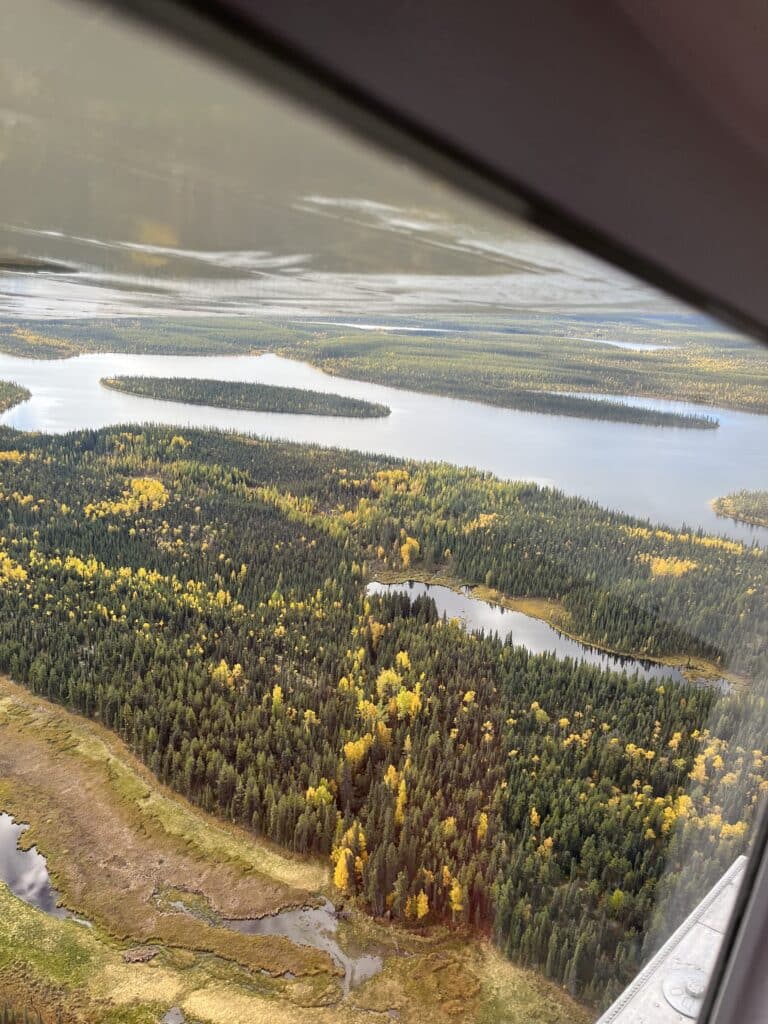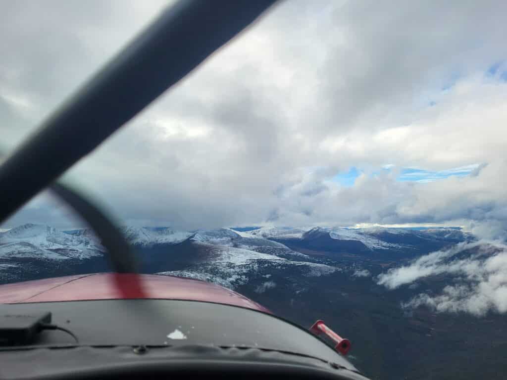 Tatsächlich war es kein „Geradeaus-Schönwetter-Flug“. Marcus musste einigen Wolkenbändern ausweichen. Bei der einen Entscheidung „unter oder über die Wolken“ entschied er sich für „unten“ (so sehen die Passagiere mehr 😉 ) und man glaubte, gleich die Baumwipfel zu touchieren. Wir sahen sogar Wildlife (Elche), so tief waren wir, als wir über Seen, durch Täler und an Bergrücken vorbeirasten. Übrigens, auf einem der Bilder versteckt sich ein Elch 😉