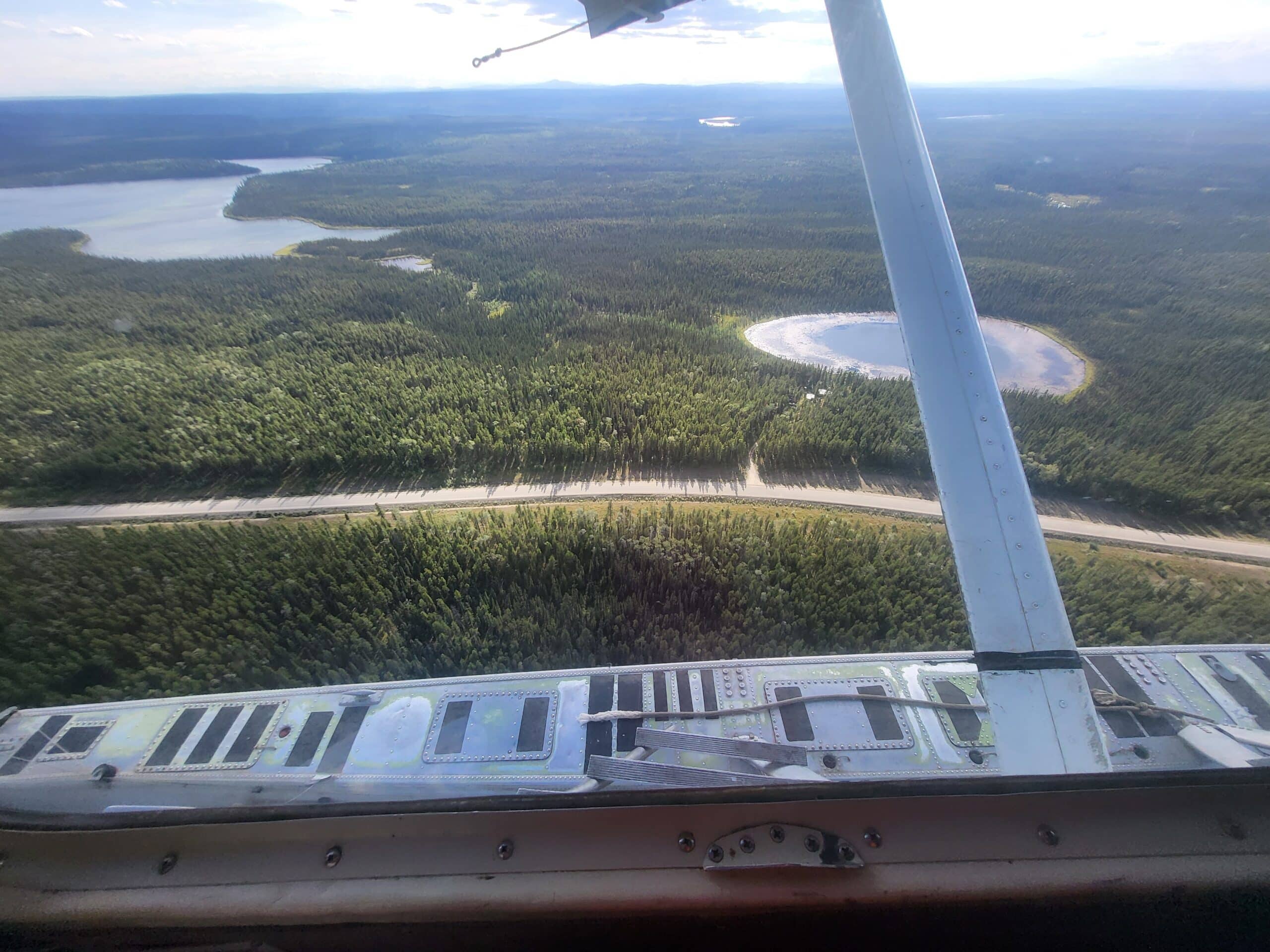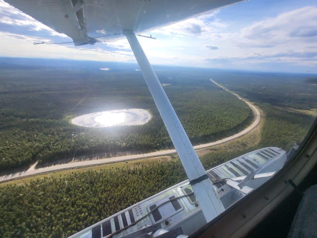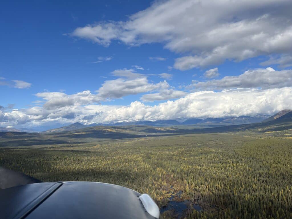 Tatsächlich war es kein „Geradeaus-Schönwetter-Flug“. Marcus musste einigen Wolkenbändern ausweichen. Bei der einen Entscheidung „unter oder über die Wolken“ entschied er sich für „unten“ (so sehen die Passagiere mehr 😉 ) und man glaubte, gleich die Baumwipfel zu touchieren. Wir sahen sogar Wildlife (Elche), so tief waren wir, als wir über Seen, durch Täler und an Bergrücken vorbeirasten. Übrigens, auf einem der Bilder versteckt sich ein Elch 😉