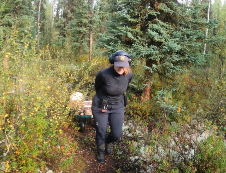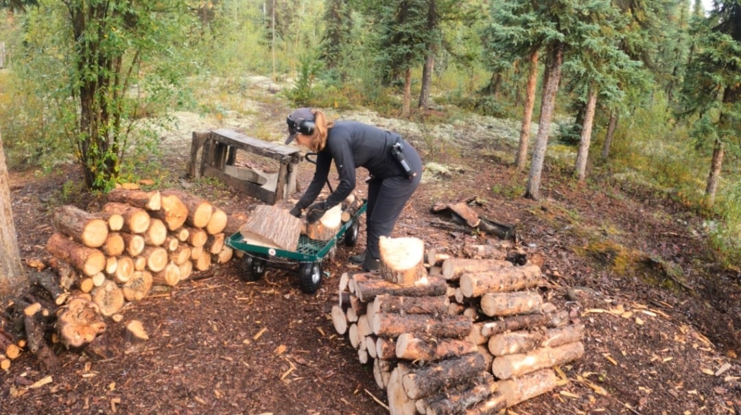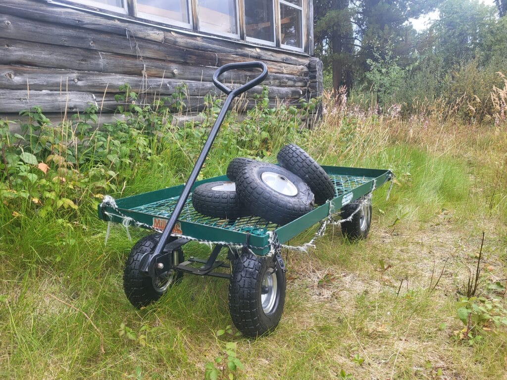In Whitehorese habe ich bei Canadian Tire vier neue Rädli für den grünen Wald-Porsche gekauft. Ein Radwechsel war dringend nötig, hatte doch keiner der vier alten Pneus noch Luft drin. Mit den aufgeschlitzten Rädern liess es sich nicht gut Holz (und anderes Material transportieren). Also habe ich mich gleich am ersten Tag nach dem Frühstück an die Arbeit gemacht und nun hüpft das Wägeli wieder über jeden Stein und jede Wurzel.