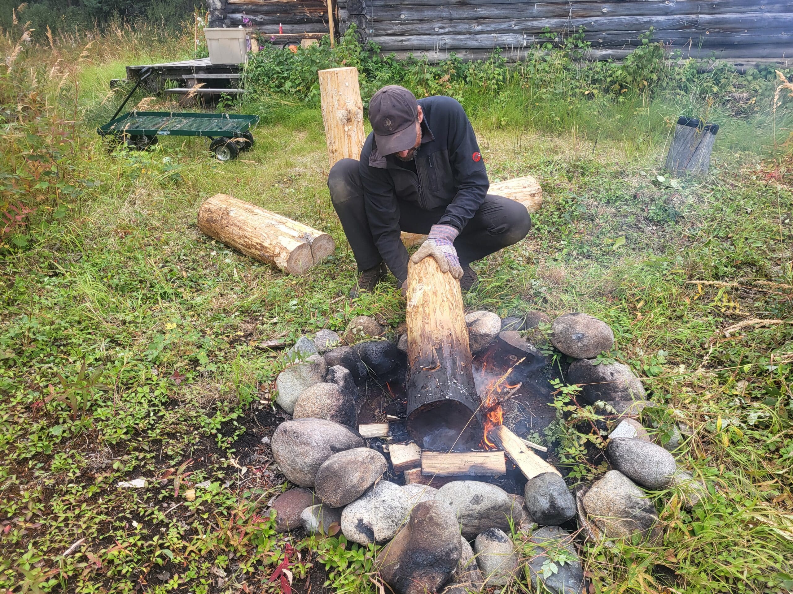Kaum, dass der letzte Stamm auf den Platz gefallen war, machten wir uns ans Frühstück, um danach fit für die Logosol zu sein. Damit machten wir weiter, bis es gegen 17 Uhr Kaffee und Kuchen auf dem Steg gab. Oliver nahm seine Angel mit und fing sehr rasch einen Hecht fürs z’Nacht (Hecht mit Kartoffeln, Rüebli und Salat). Also wurde dieser filettiert und die Fischabfälle mit dem Kanu raus auf den See gebracht und versenkt.