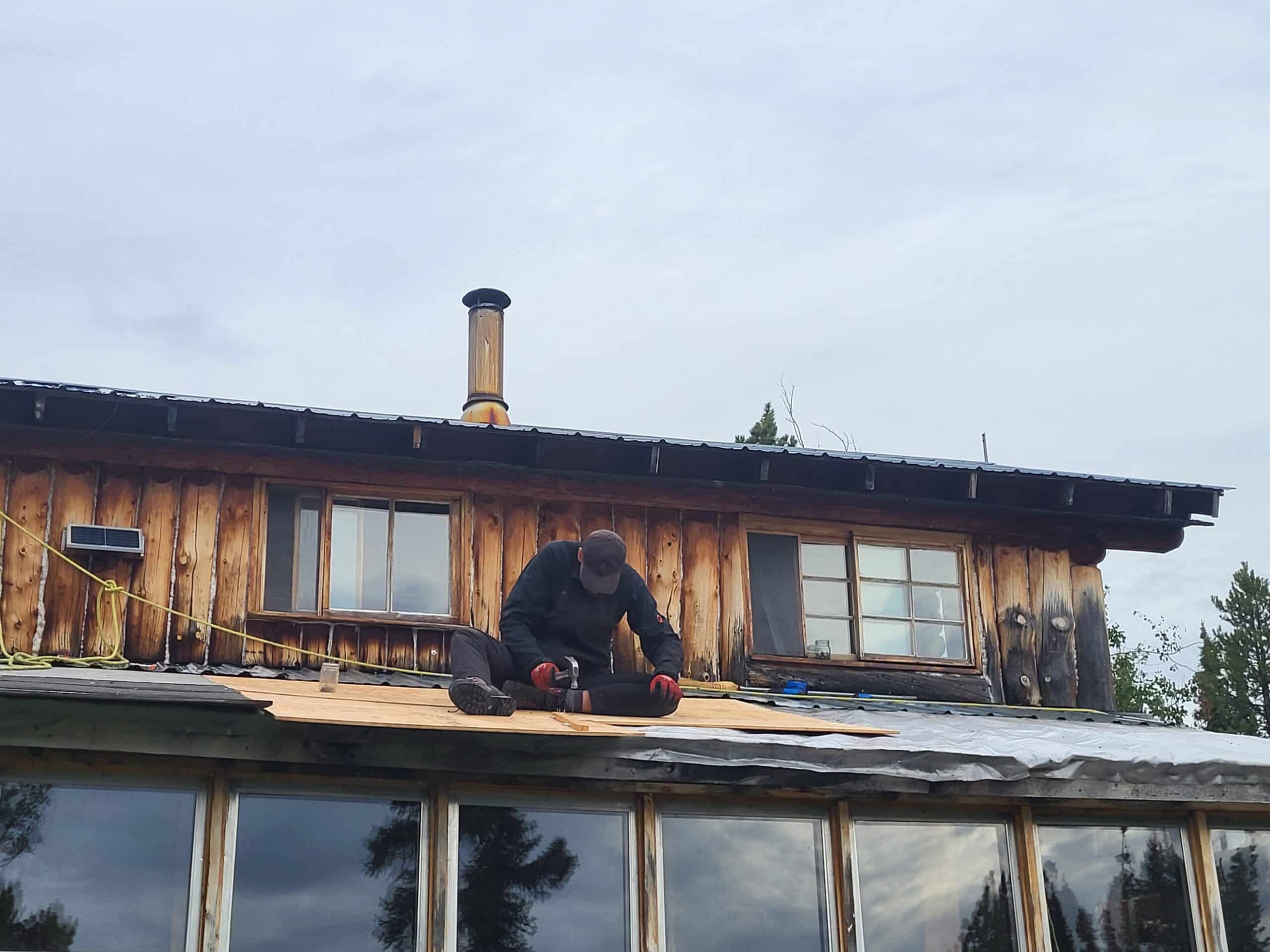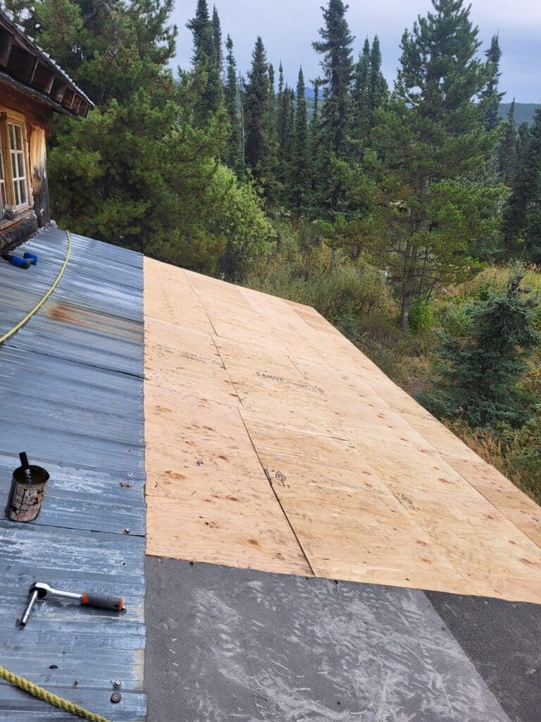 Für uns gab es noch keinen Feierabend. Wir entschieden, das Tageslicht und das trockene Fenster noch zu nutzen und Oliver nagelte das Plywood sowie zwei Bahnen dünne Dachpappe auf die am Morgen befestigte Plastikfolie. Für die dritte Reihe wurde es leider zu dunkel, also räumten wir alles rein und verschoben in die Hütte.