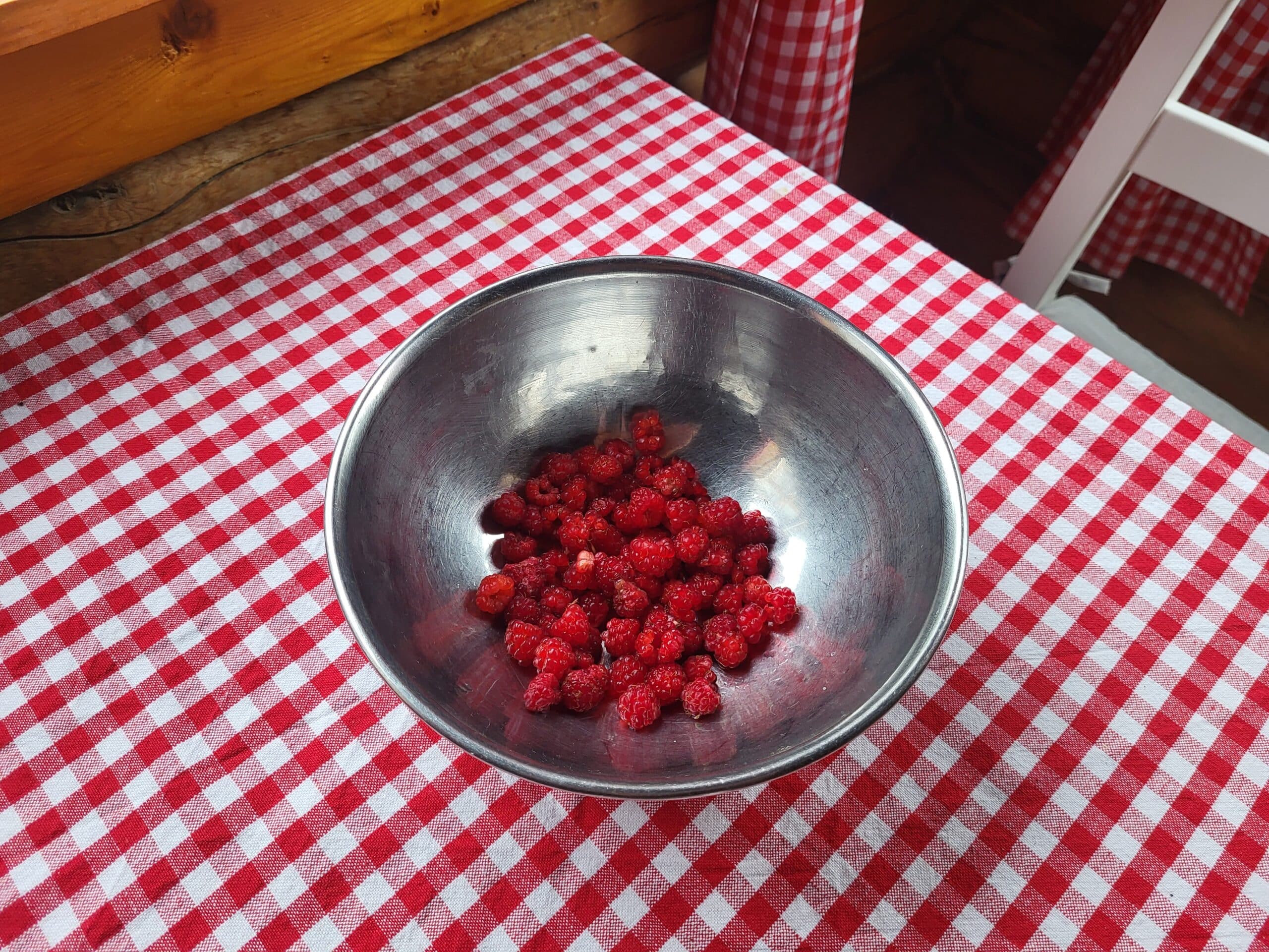 Während Oliver auf dem Dach turnte, nutzte ich ein paar Minuten die Gelegenheit, die letzten Himbeeren zu sammeln. Es gibt sehr viele Himbeerstauden, aber wir waren etwas spät dran für die Ernte. Die meisten Beeren waren bereits verblüht. Einige wenige fanden am Abend aber doch den Weg in unsere Bäuche. Ein Leckerbissen! 🙂