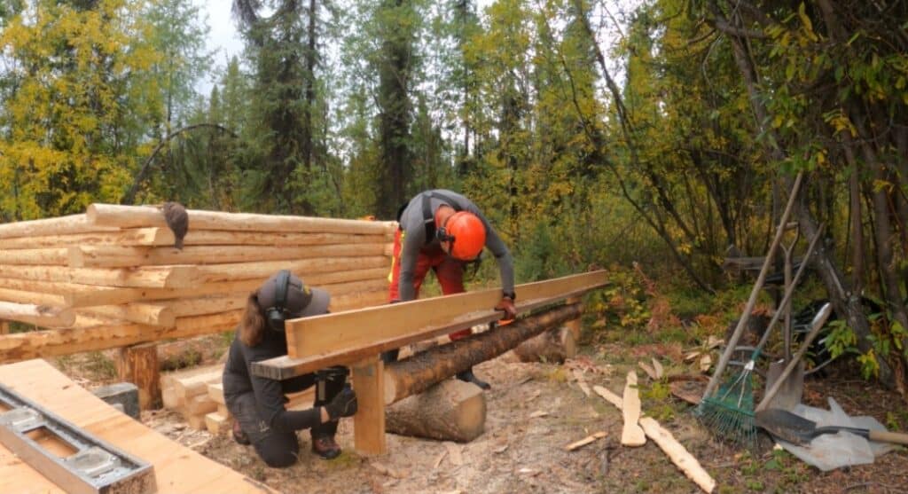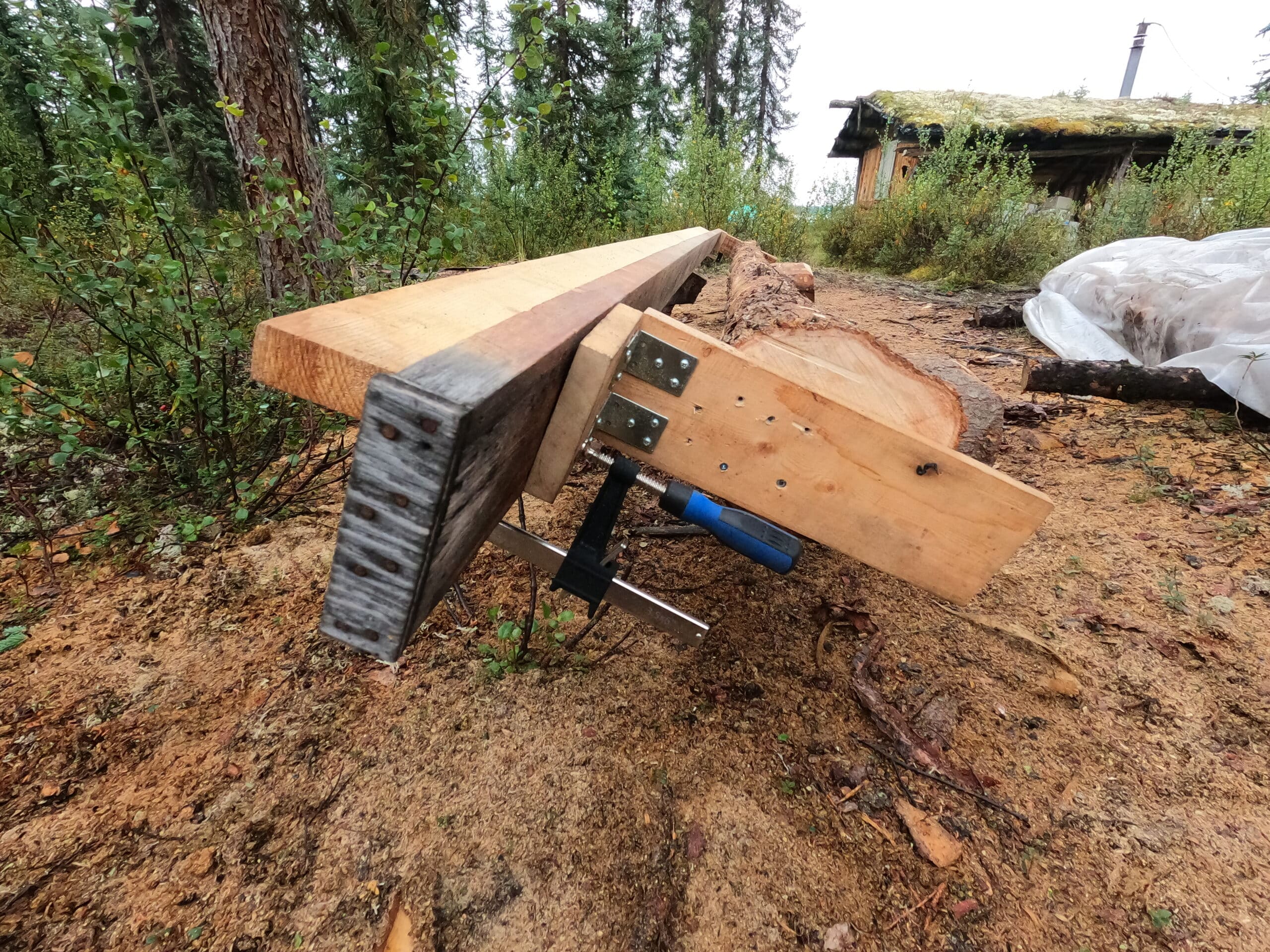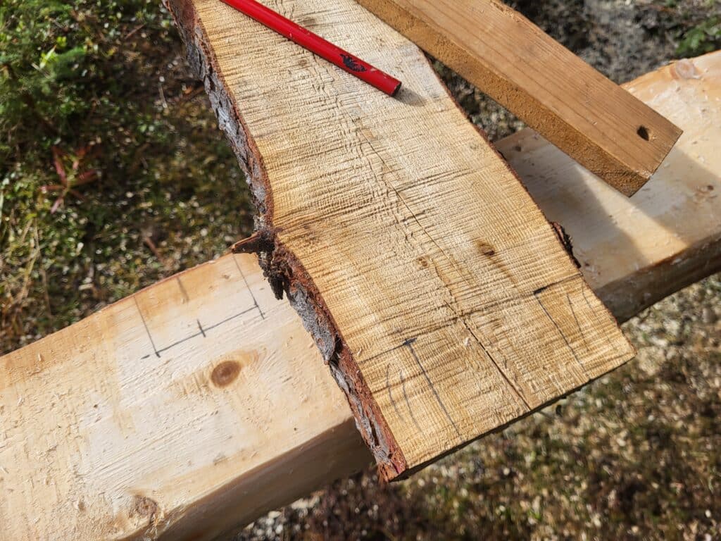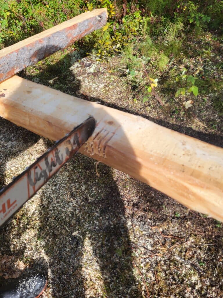 Ohne Motorsäge standen wir vor einigen Fragen: Was ist mit den Dachbalken? Was ist mit der Veranda? Was machen wir mit der Türe? Brauchen wir für den Einbau des Ofens zwingend eine Motorsäge? So oder so: Es gab nicht viele Alternativen, ausser viel Muskelkraft. Damit fing es auch gleich an: Oliver hackte und sägte den Rest der Ostseite zu einer Schräge, auf welcher wir später die Dachbalken nageln konnten. Apropos Dachbalken. Hier mussten wir wohl auch kreativ werden. Der Plan, die Bretter selber mit der Logosol zu sägen, funktionierte nicht mehr.