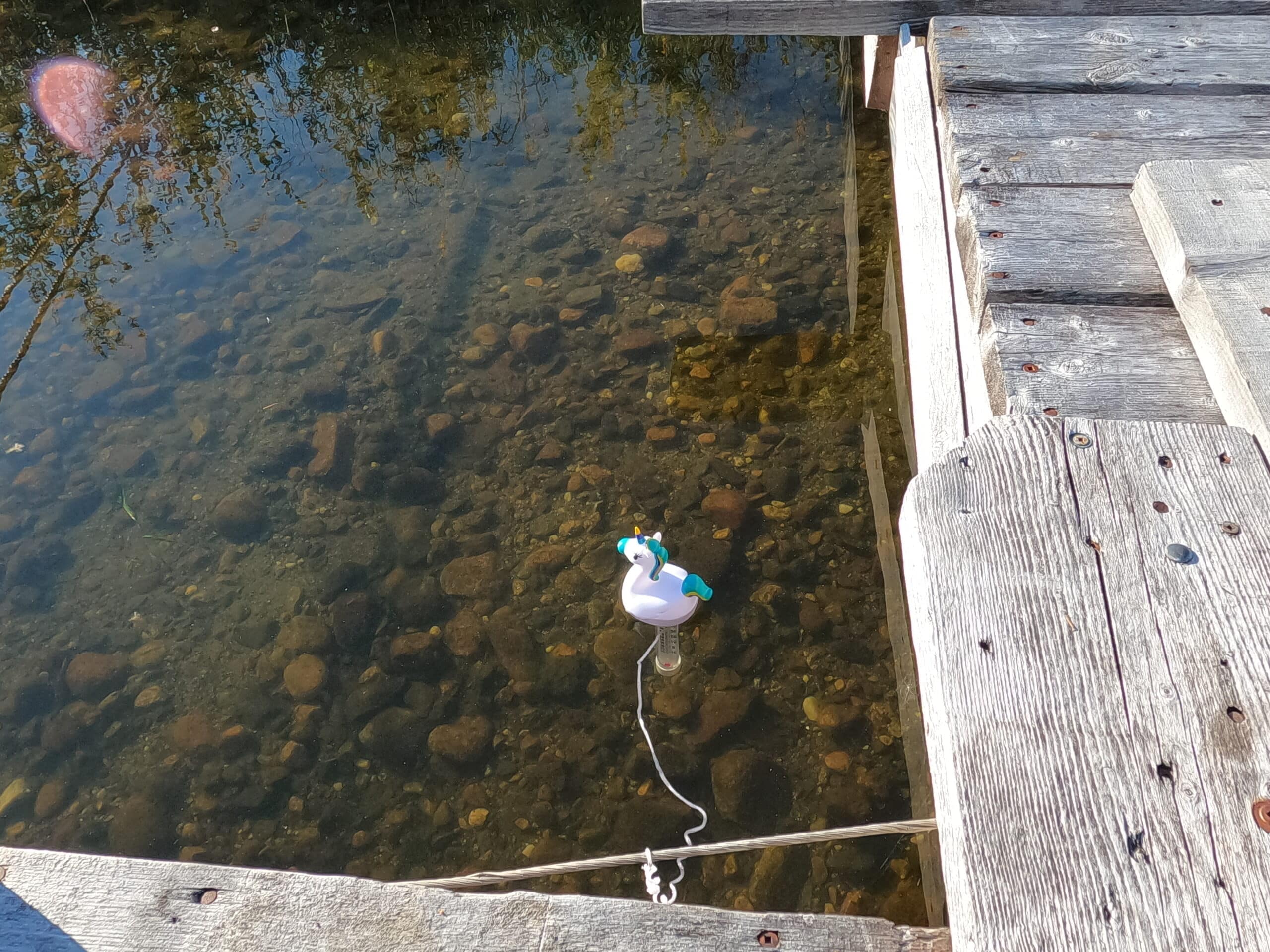 Während ich einige Notizen für diesen Bericht erstellte, nahm Oliver mit dem Kanu eine Begutachtung des Stegs vor. Sein Fazit: Es ist klar, dass der Steg repariert resp. das Fass ersetzt werden muss.