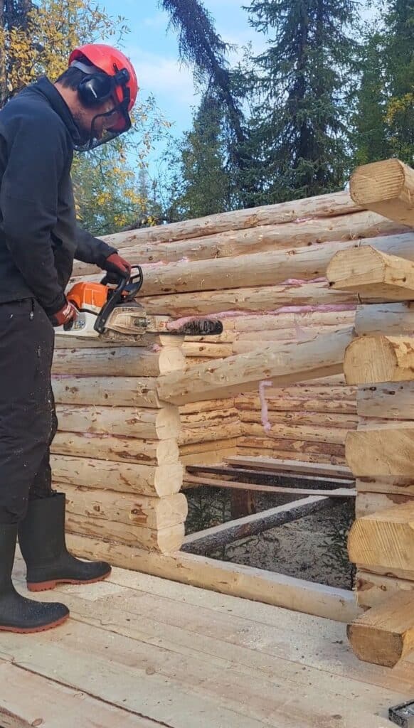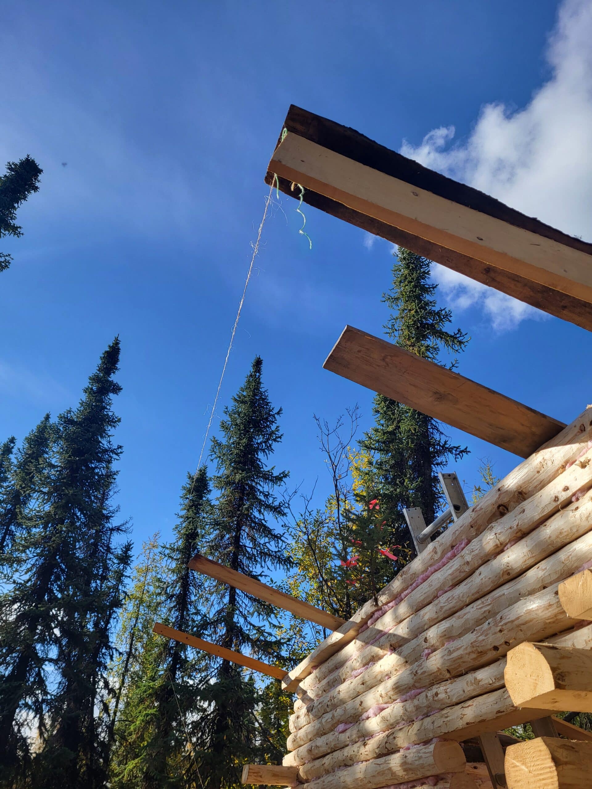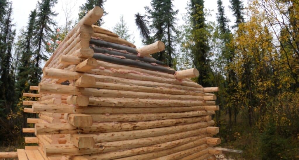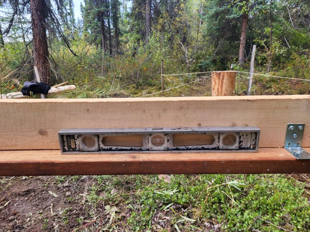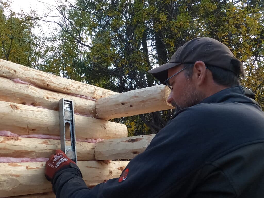 Bei 3 der 5 Reihen recycelten wir auf der Ost- und Westseite alte Balken. Diese stammen aus dem angefangenen Cabin der Vorbesitzer.