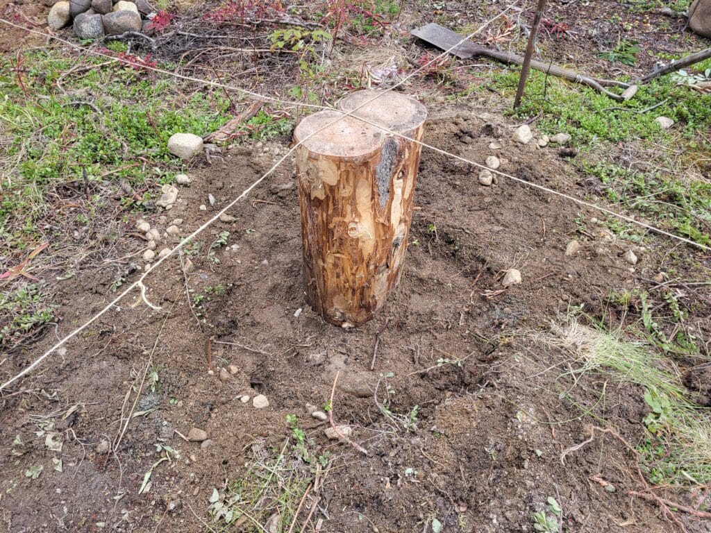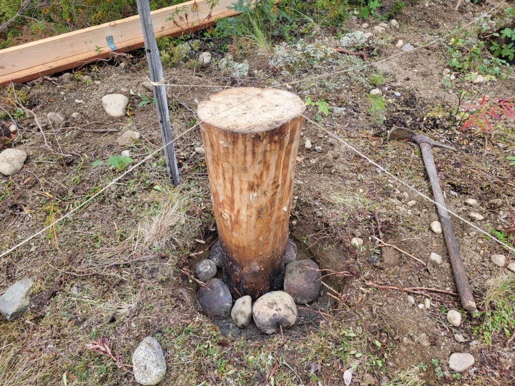 Jede gute Blockhaussauna muss auf einem stabilen Fundament stehen. Dazu gibt es mehrere Möglichkeiten. Wir haben uns für Holzpflöcke entschieden und ein wenig Recycling betrieben. Die beiden „Barhocker“ unserer Eisbar vom letzten Winter wurden kurzerhand in zwei der vier benötigten Fundamente umfunktioniert. Zwei weitere Pflöcke à je ca. 80 cm organisierten wir im Wald. Alle vier Pflöcke erhielten aber das gleiche Verarbeitungsprogramm: Sie mussten entrindet und im Feuer geschwärzt werden. Dafür machte Oliver ein Lagerfeuer und wendete die Stämme in der Flamme, bis sie zur Hälfte (die Hälfte, die im Boden versenkt wird) schwarz waren.
