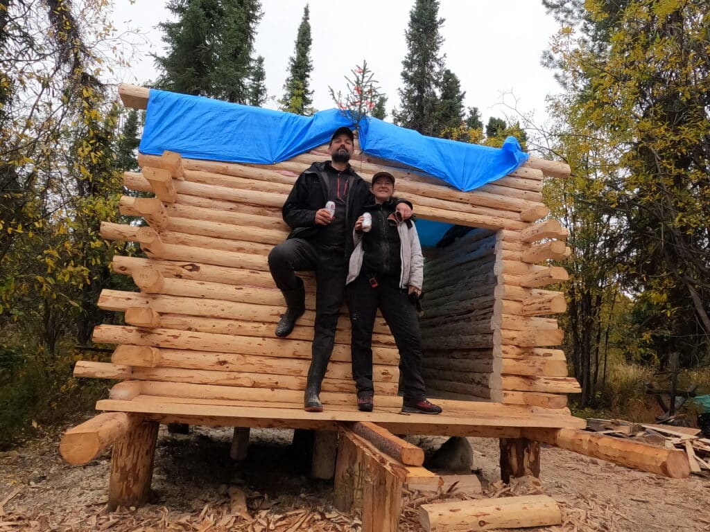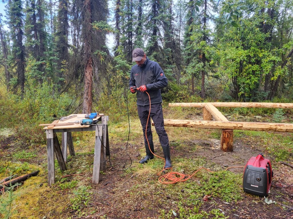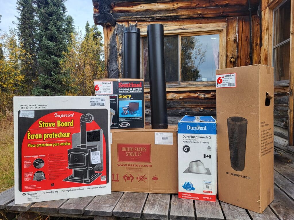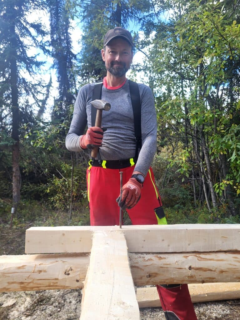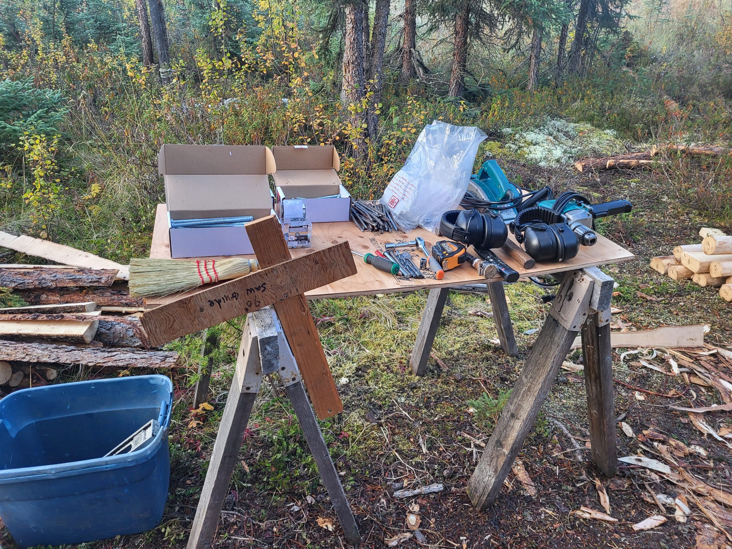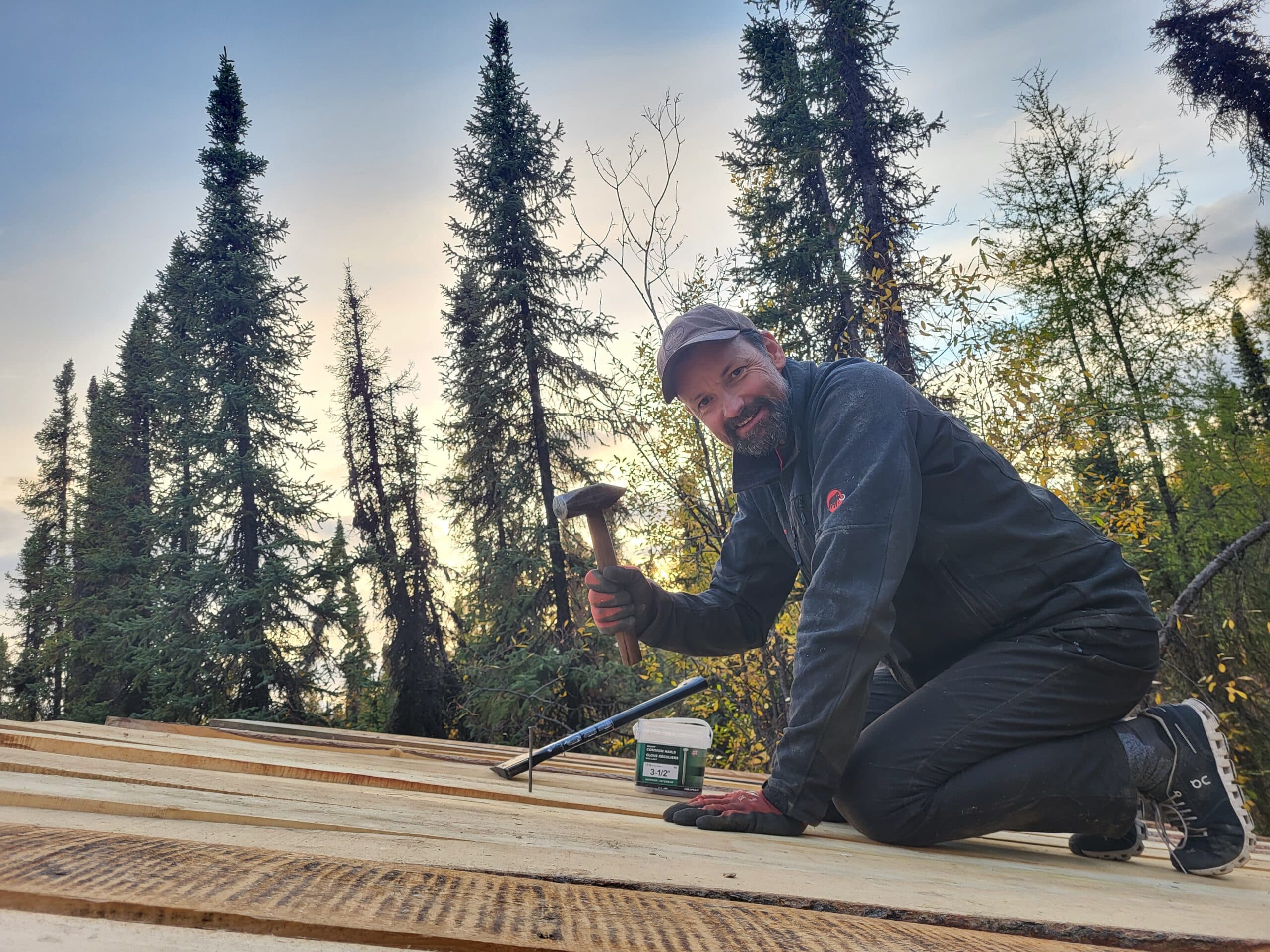 In Whitehorse konnte Tom uns mit seinem Wissen unterstützen. Gemeinsam gingen wir durch die Gänge von Home Hardware und Canadian Tire und suchten alle nötigen Schrauben, Nägel, Ofensystemteile, Dämmwolle (auch Rosaroter Panther genannt) und eine feuerfeste Platte für den Boden zusammen. Alle diese Dinge wanderten am Anreisetag erst mal in die Werkstatt und wurden mit dem Baufortschritt Stück für Stück wieder rausgetragen.