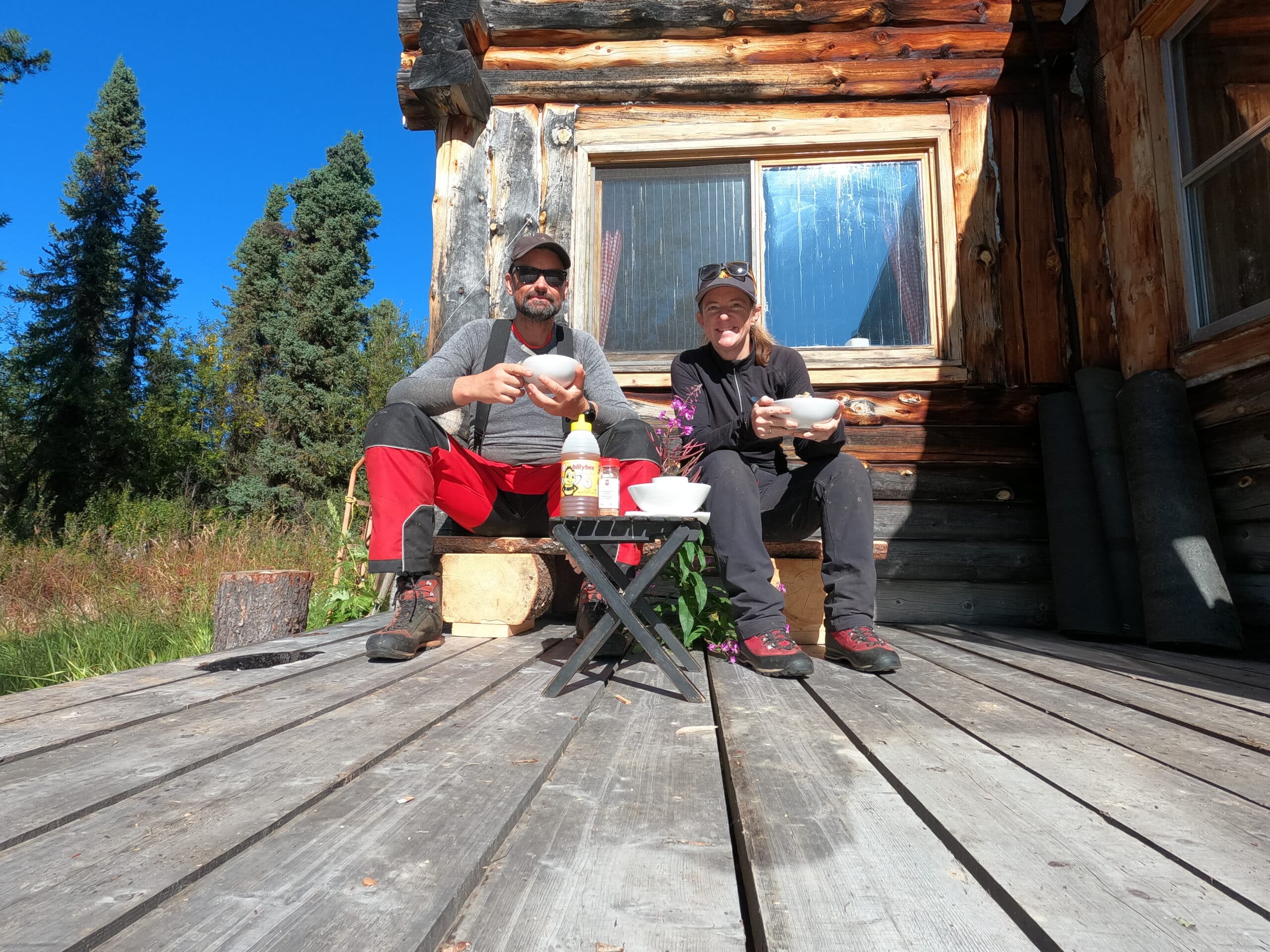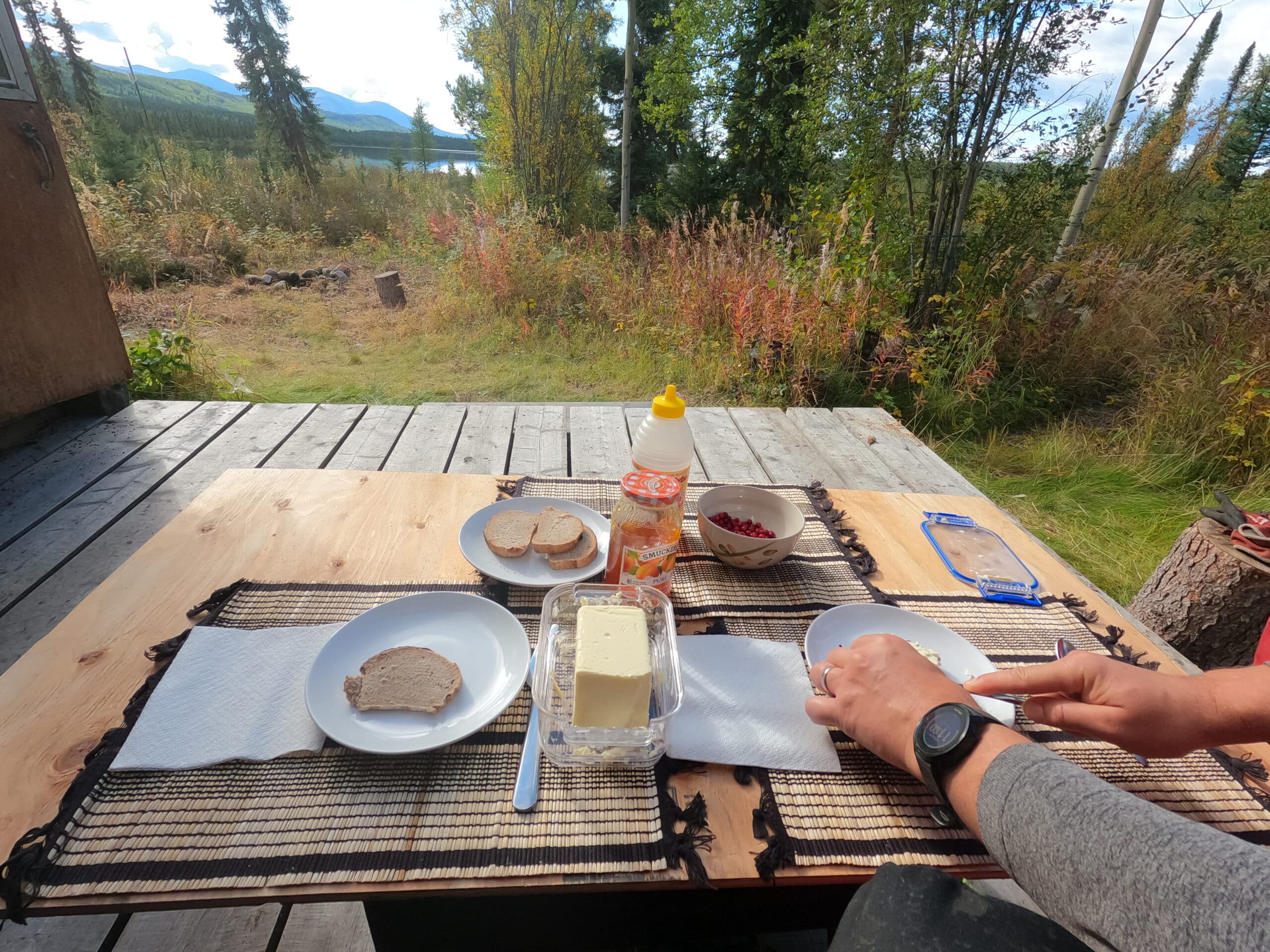 Für etwas Spannung sorgte die Wetterprognose am Freitag für den kommenden Montag. Das war leider auch schon der Tag, an welchem wir nach Whitehorse fliegen sollten und unser inReach zeigte Regen mit einer hohen Wahrscheinlichkeit an. Also texteten wir Gerd, ob Montag noch ok ist. Er fragte zurück, ob auch Sonntag (der einzige Tag mit guten Wetter) ok wäre. Wir antworteten, für uns passe alles, solange wir eine gewisse Vorlaufzeit hätten (es gibt viel zu tun in und um die Hütten, bevor man abreisen kann).