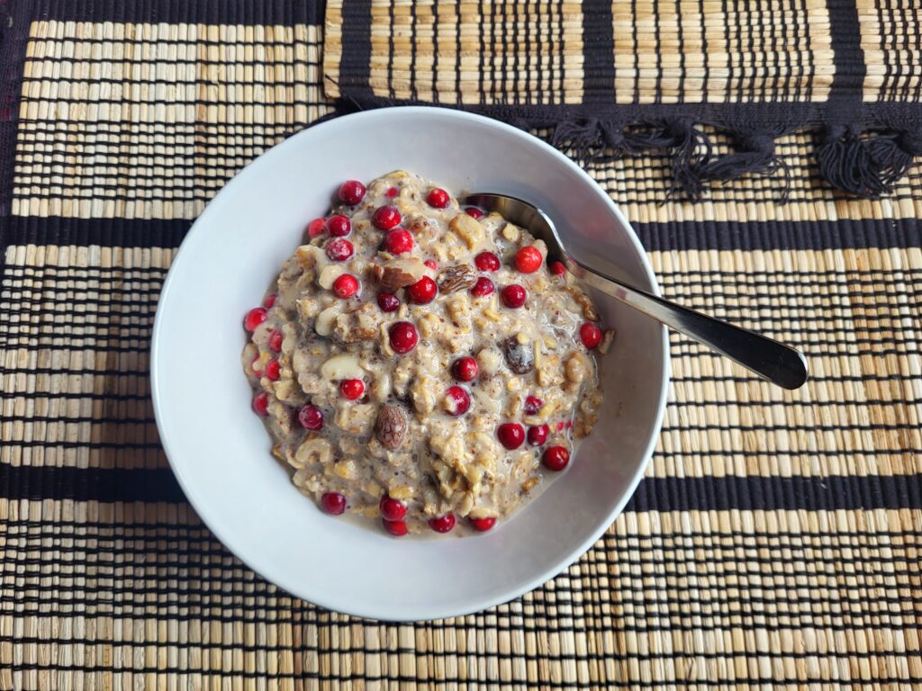 Das Abendessen war eine Restenverwertung: Es gab superleckere Salad-Bowl mit Salat aus dem eigenen Garten, Feta, Zwiebeln, Rosinen, Preiselbeeren, Walnüssen und ein Stück selbstgemachtes Nuss-Brot.