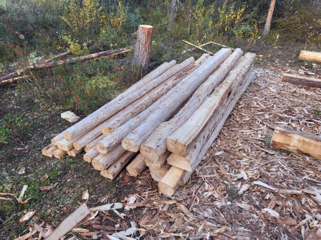Der offizielle Startschuss für den Bau ertönte schon am zweiten Tag. Der Tag begann früh, um 6:45 Uhr heizten wir ein und es gab Kaffee. Noch vor dem Frühstück machten wir uns ans Werk. 5 gefällte Bäume sollten es bis zur Pause werden, was wir auch geschafft haben. Am Anfang haben wir die gefällten Bäume noch fertig bearbeitet (restliche Länge in Rugeli aufgeschnitten und zum Holzplatz gebracht). Das ist aber sehr zeitintensiv und wir beschlossen, diese Arbeit auf den Schluss der Ferien zu legen und erstmal mit der Sauna vorwärts zu machen.