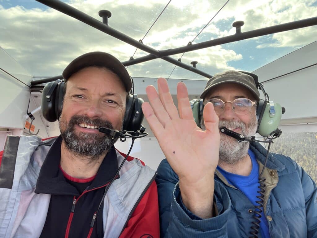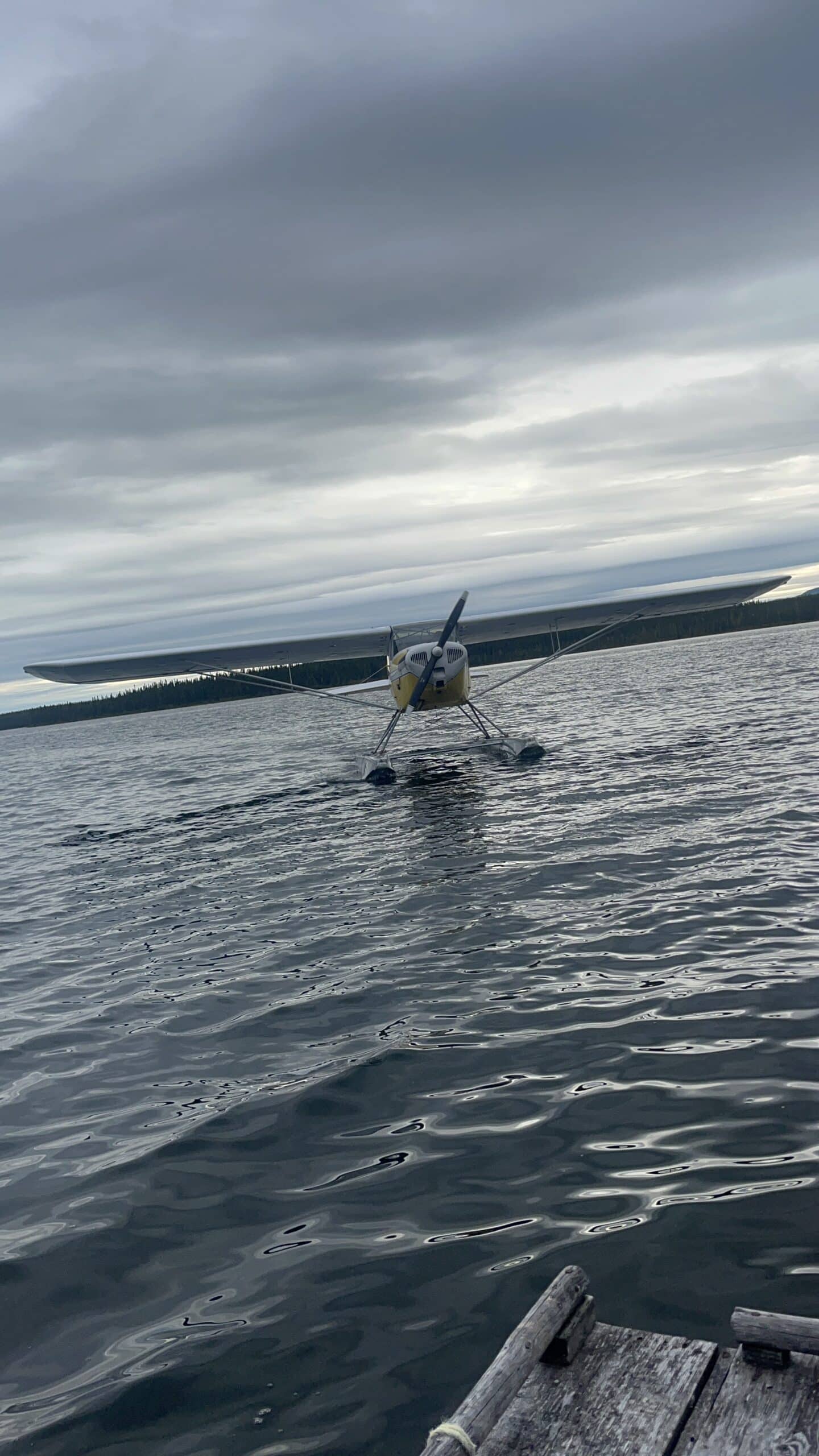 Zurück bei der Hütte räumten wir das Gepäck zum Steg (in der Hoffnung, dass es nicht regnet) und Oliver fing an, das Türpaneel festzumachen. In diesem Moment hörten wir den Propellerlärm und tatsächlich holte uns Marcus, einer von Gerds Piloten, wie versprochen pünktlich ab.