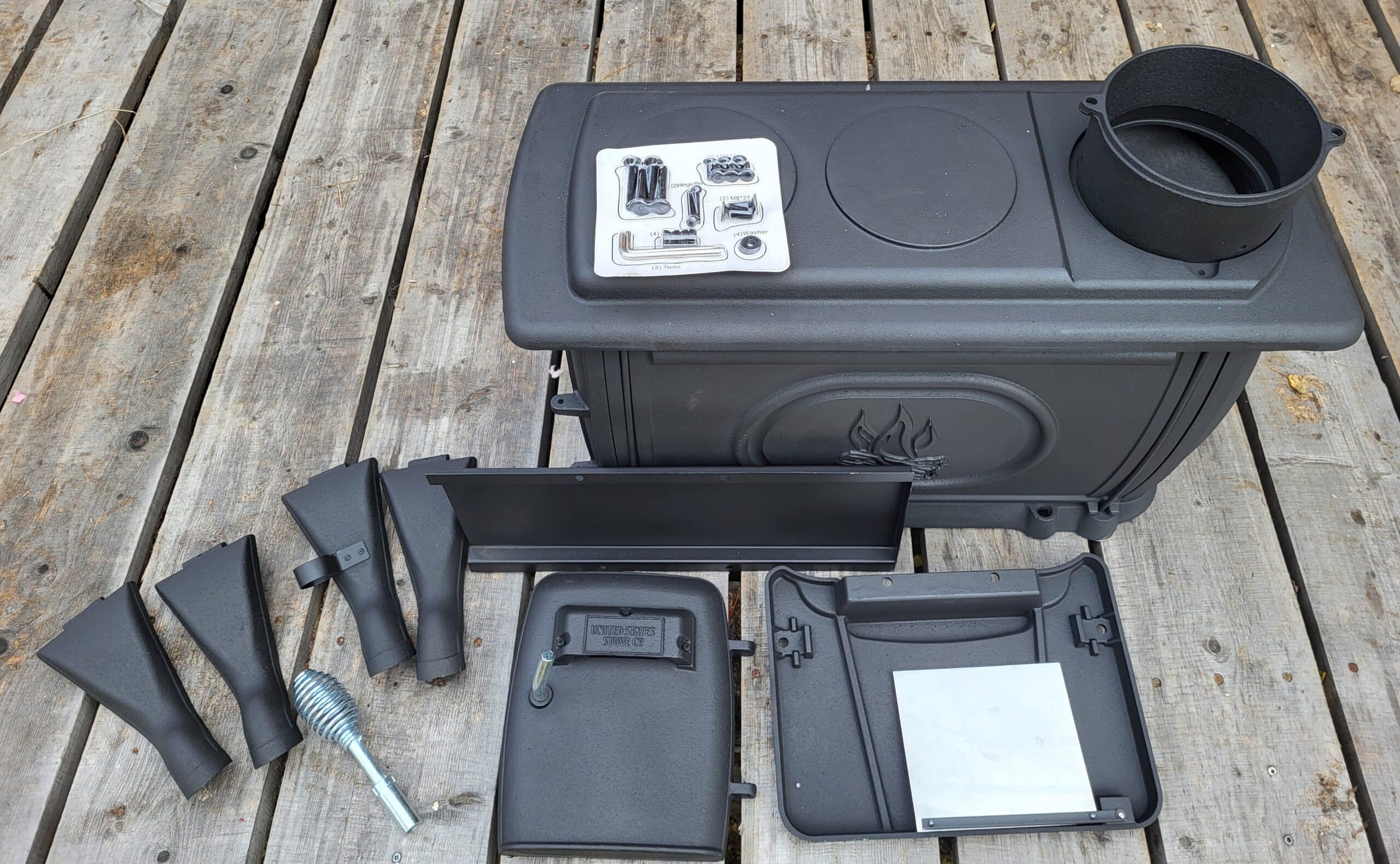 Jetzt ging es Schlag auf Schlag. Ein weiterer frischer Morgen begrüsste uns für den nächsten Meilenstein. Dass sich dieses Vorhaben mühselig gestalten könnte, damit hätten wir rechnen können. Wie mühselig – das wussten wir allerdings erst gegen Mittag. Motiviert starteten wir mit dem Unboxing des Ofens und allerlei weiteren Ofen-Installations-Teilen. Ich schraubte den Ofen zusammen und Oliver schnitt in dieser Zeit weitere Holzreihen aus der Türe, um den Eingang etwas rückenfreundlicher zu gestalten. Er musste dies mit der Handsäge machen (Gründe bekannt) und das war zeitintensiv. Die Zeit reichte grade so, um noch vor dem Regenguss eine Schicht Plastikfolie (im unendlichen Fundus des Tool-Shed von Rosies gefunden) auf dem Dach festzunageln, bevor der Regen kam.