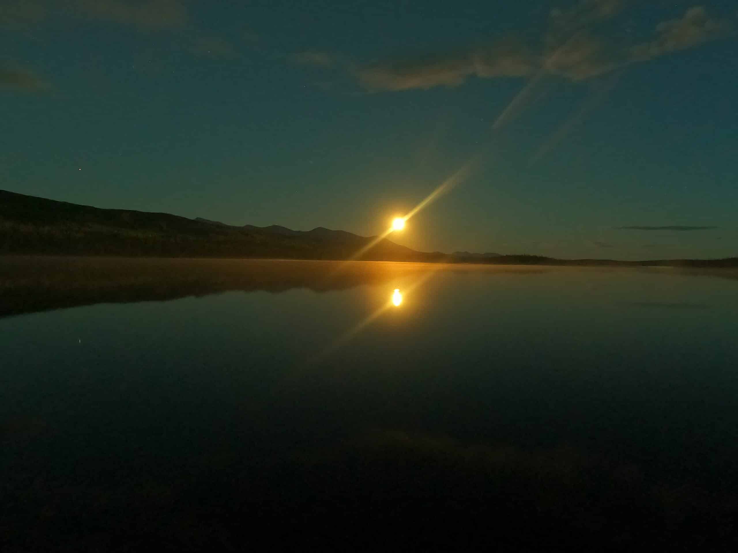 Noch bevor wir die Reste der Gerstensuppe auf den Herd stellten, meinte Oliver, dass er das Apérobierli gerne im Dunkeln auf dem Steg trinken würde. Es war kurz vor Vollmond und mittlerweile war der Mond über die Berge geklettert und strahlte hell und nah auf Rosie Lake. So packten wir uns warm ein (ich zog Olivers dicke Daunenjacke an) und marschierten zum Steg. Der Mond war fantastisch – aber dann wurde aus einer fantastischen Stimmung eine wahrliche „Magic Night“!