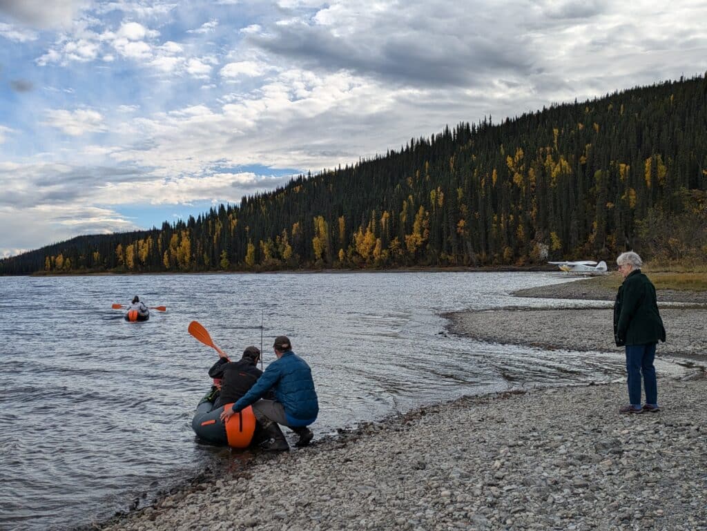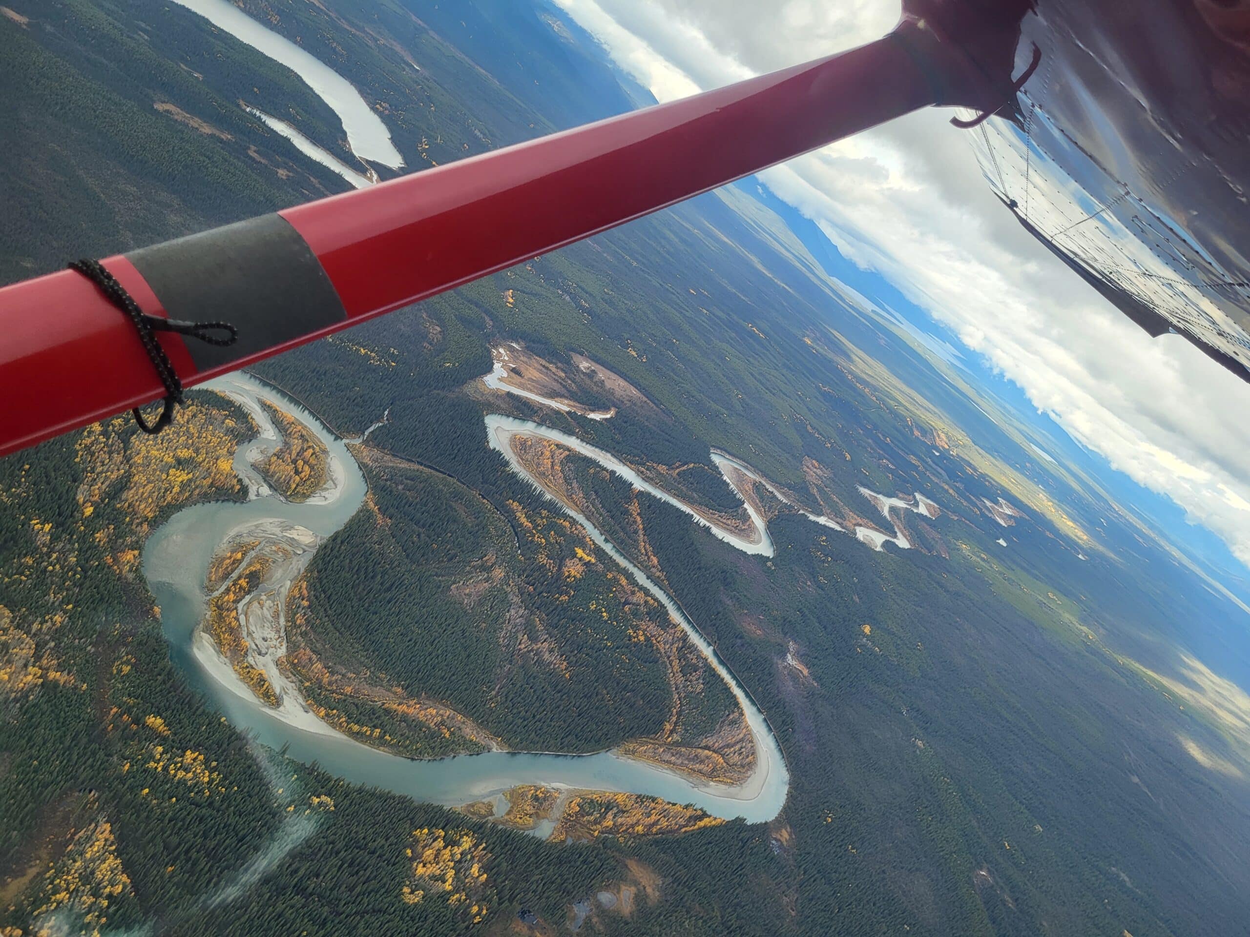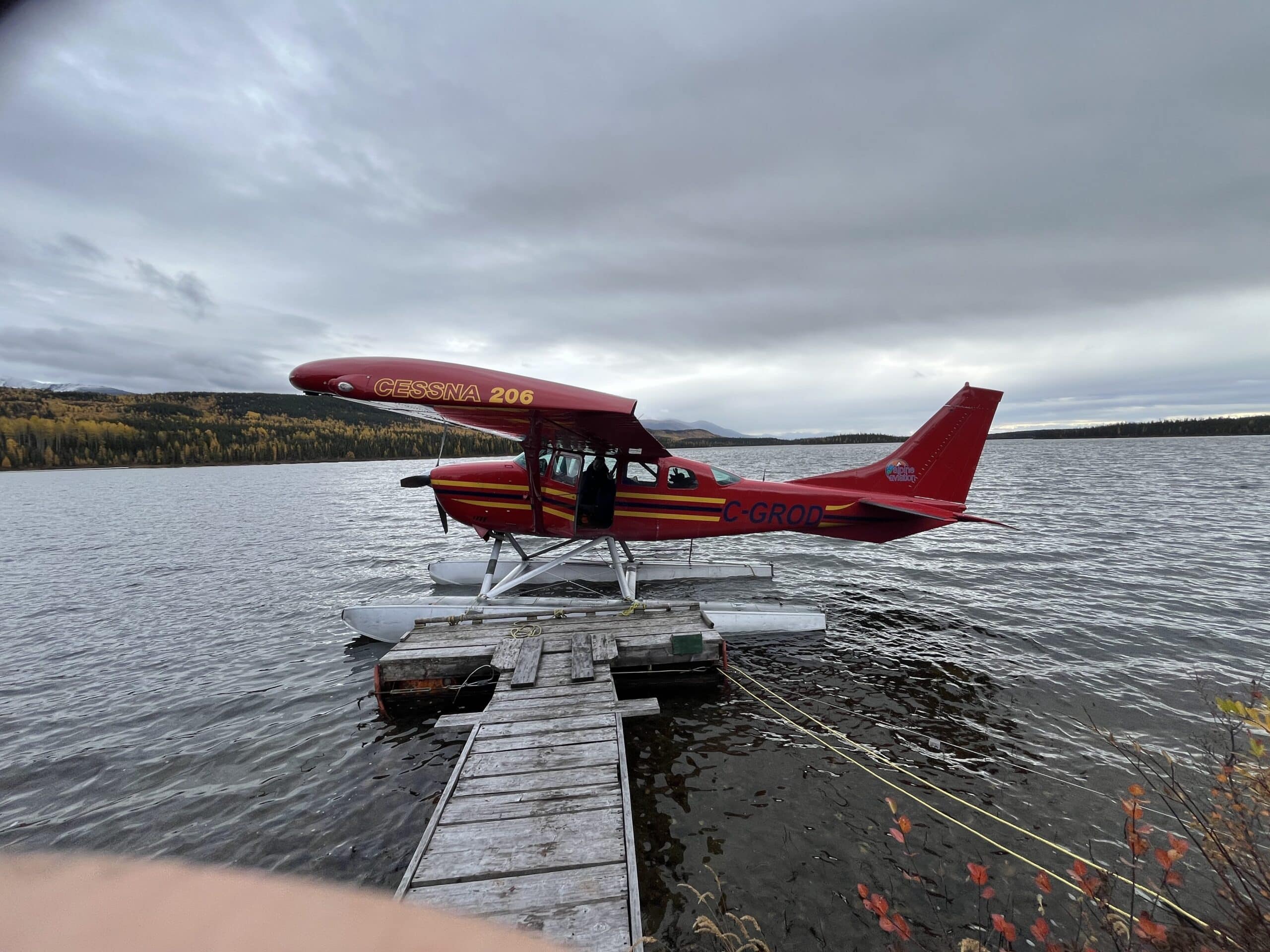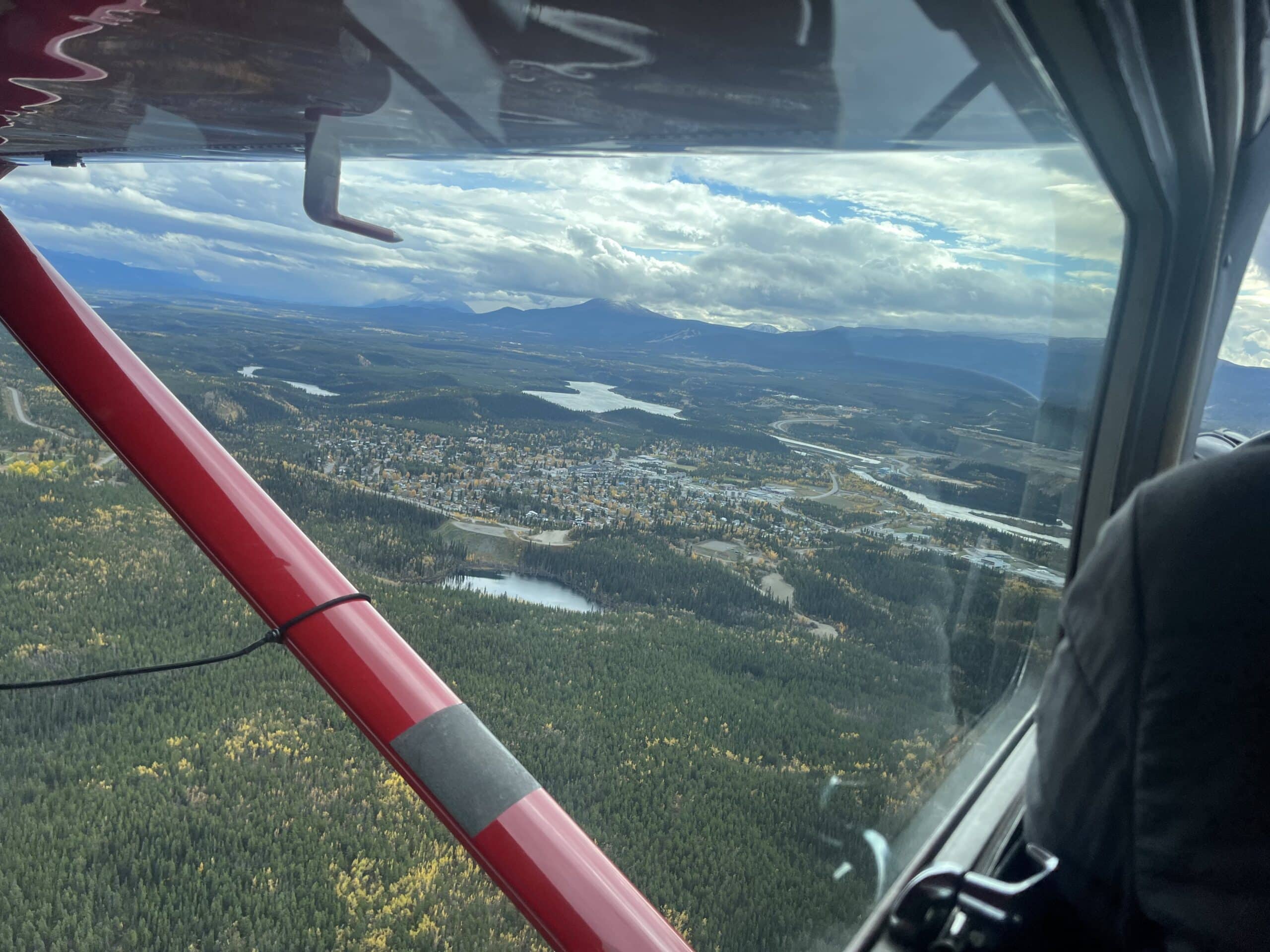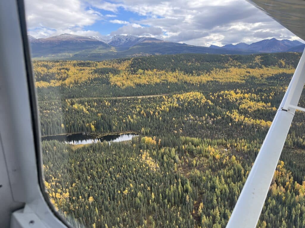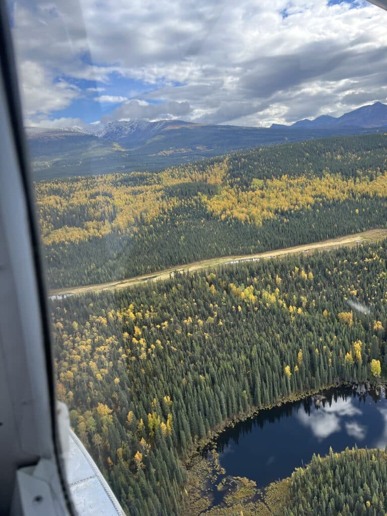 Pünktlich landete er auf unserem See. Zuerst war ich dran. Wir luden das Gepäck (die Rucksäcke mit den Packrafts und die Angelausrüstung) ein, dann kraxelte zuerst Joe, danach ich in das kleine Flugzeug. Er gab Gas und kurz darauf hoben die Floats aus dem Wasser ab. Joe drehte nach rechts ab und der herbstliche Wald flog unter uns vorbei. Es war ein wunderbarer Flug über goldene Baumgipfel und den Frances Lake, der an manchen Stellen türkises Wasser hat wie in der Karibik – wenn auch kurz (ca. 10 Minuten), aber hey, wie cool ist dass denn, wenn dich die Nachbarn mit dem Flugzeug abholen?! 🙂