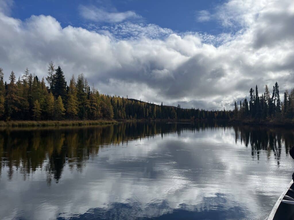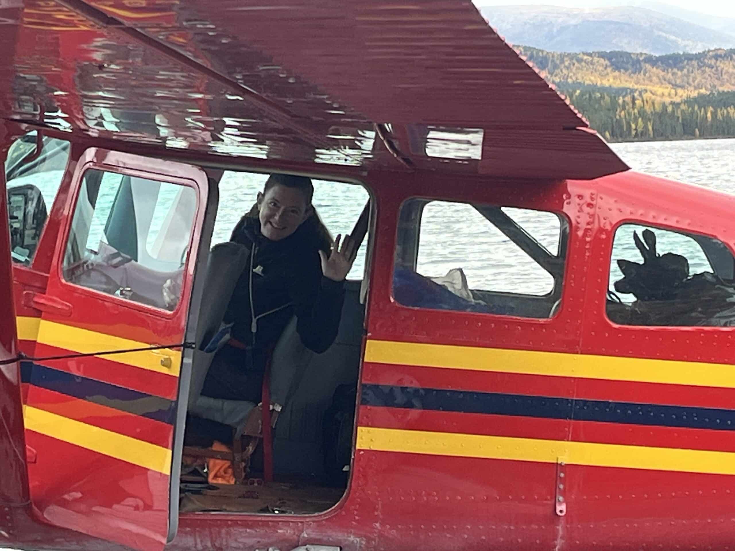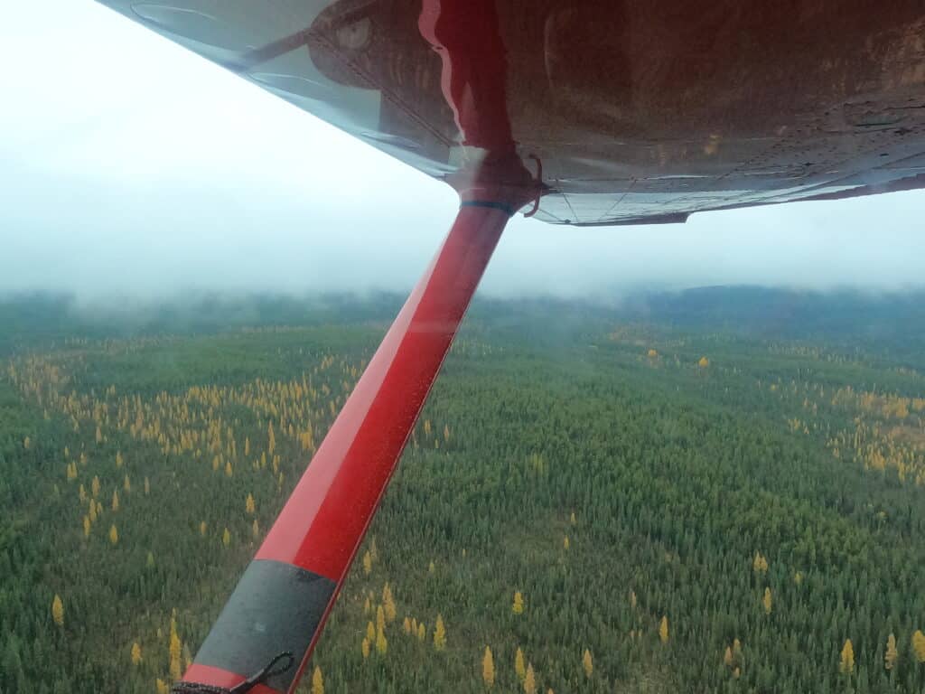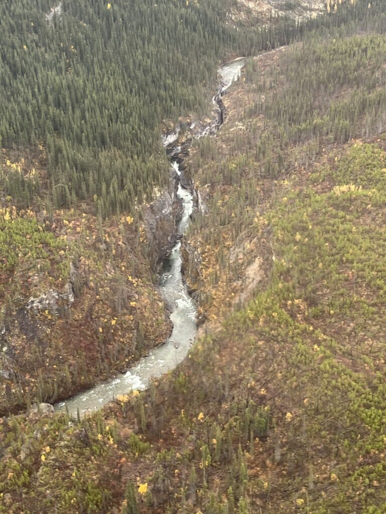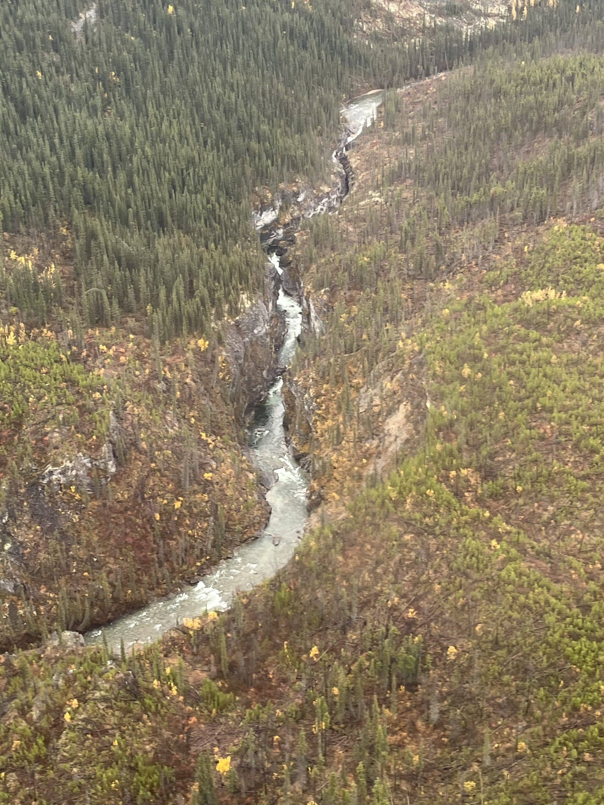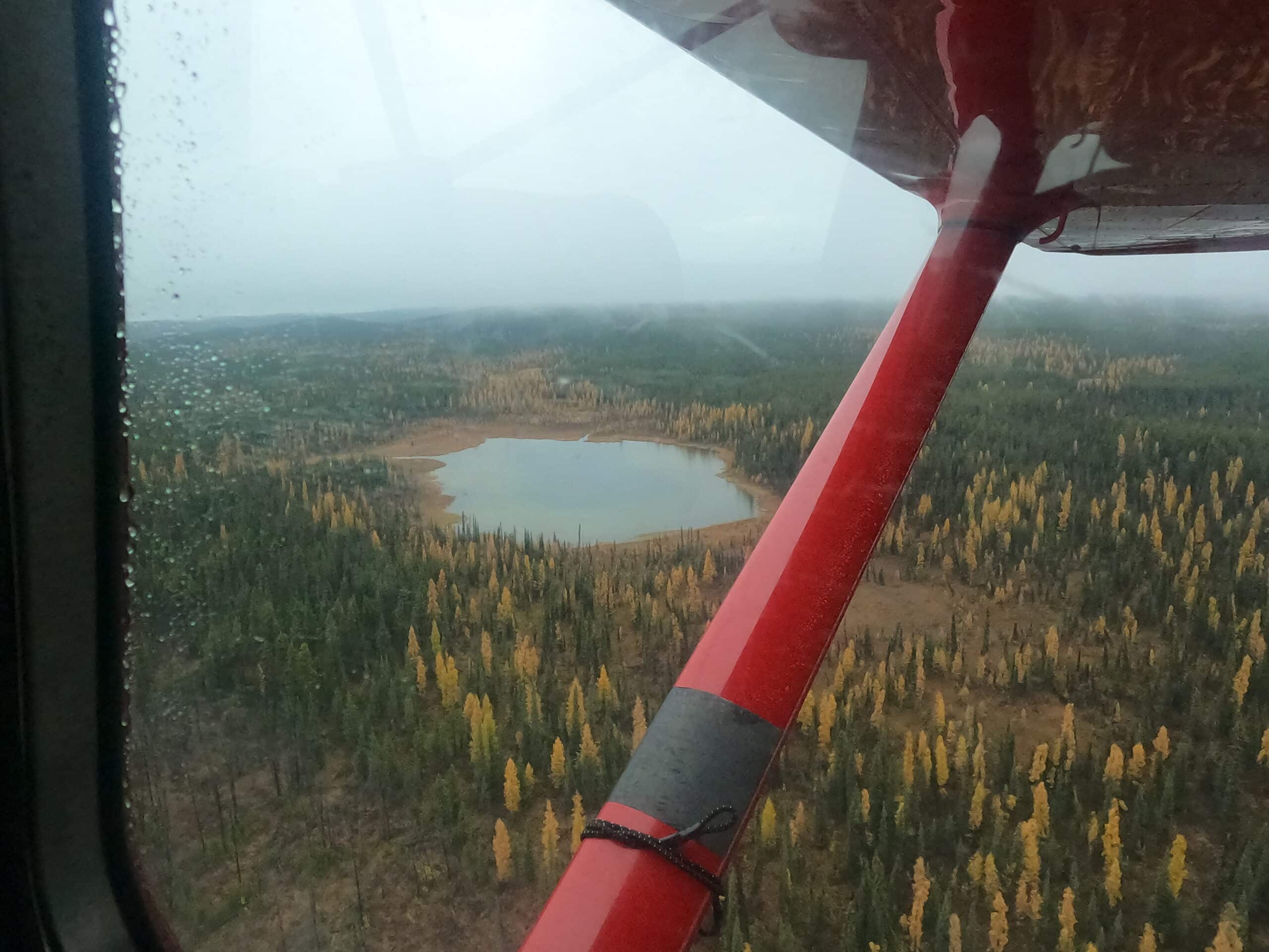 Pünktlich landete er auf unserem See. Zuerst war ich dran. Wir luden das Gepäck (die Rucksäcke mit den Packrafts und die Angelausrüstung) ein, dann kraxelte zuerst Joe, danach ich in das kleine Flugzeug. Er gab Gas und kurz darauf hoben die Floats aus dem Wasser ab. Joe drehte nach rechts ab und der herbstliche Wald flog unter uns vorbei. Es war ein wunderbarer Flug über goldene Baumgipfel und den Frances Lake, der an manchen Stellen türkises Wasser hat wie in der Karibik – wenn auch kurz (ca. 10 Minuten), aber hey, wie cool ist dass denn, wenn dich die Nachbarn mit dem Flugzeug abholen?! 🙂