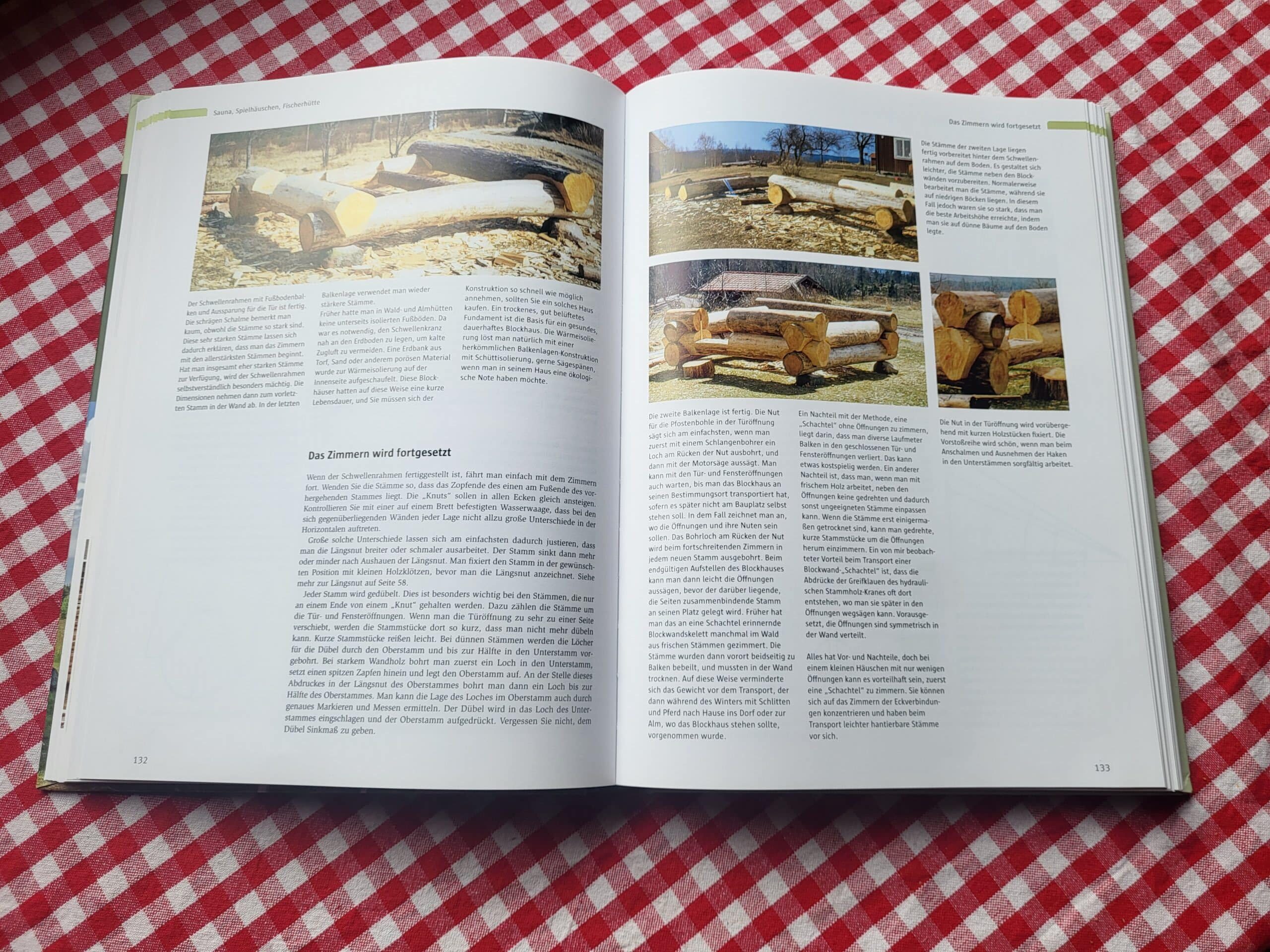 Ausserdem bestellten wir uns ein Buch, das uns mit vielen Illustrationen und Fachwissen unterstützen sollte. Als ich es daheim durchblätterte, bekam ich schon fast kalte Füsse – aber versprochen ist versprochen: Wir bauen ein Blockhaus. Und als ob das noch nicht genug Herausforderung wäre, setzten wir uns auch noch als Ziel, dass wir die Sauna in diesen Ferien schon nutzen können. Uiuiui, das könnte in Arbeit ausarten…