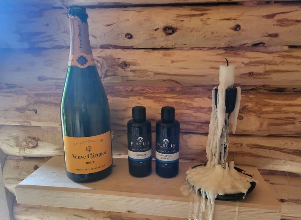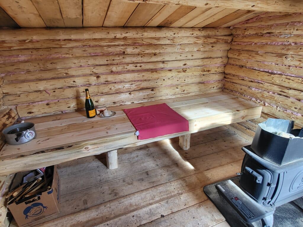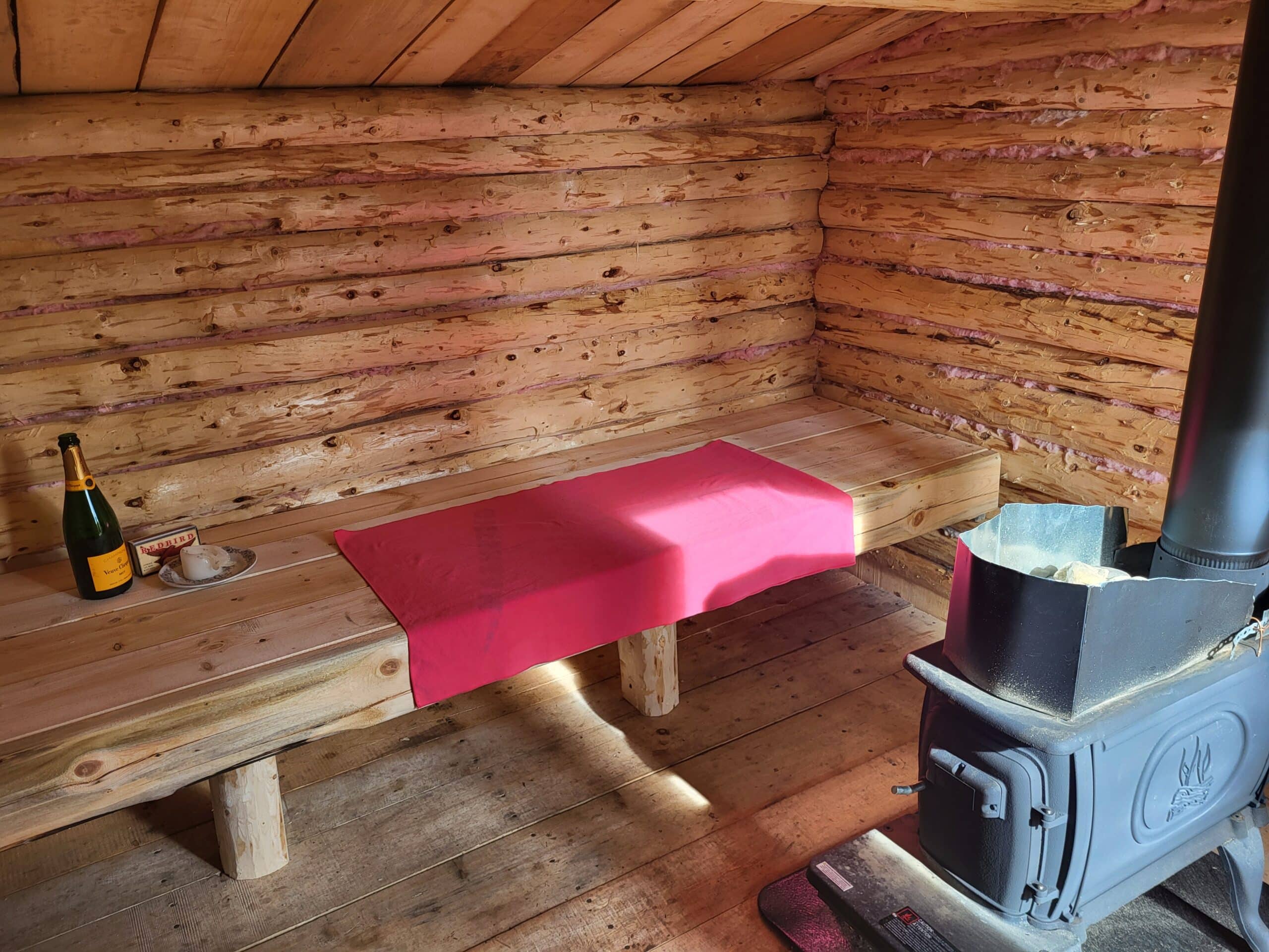 Das grosse, offizielle Opening der Sauna. Dafür hatten wir uns die mitgebrachte Flasche Champagner aufgespart und mit diesem edlen Tropfen wollten wir heute anstossen! Gesagt, getan! Nachdem wir den kleinen Ofen so richtig mit Holz gefüttert haben, genossen wir die Hitze, den herrlichen Duft nach frischem Holz und den prickelnden Champagner – es war ein supergutes Gefühl, dieses Ziel erreicht zu haben!