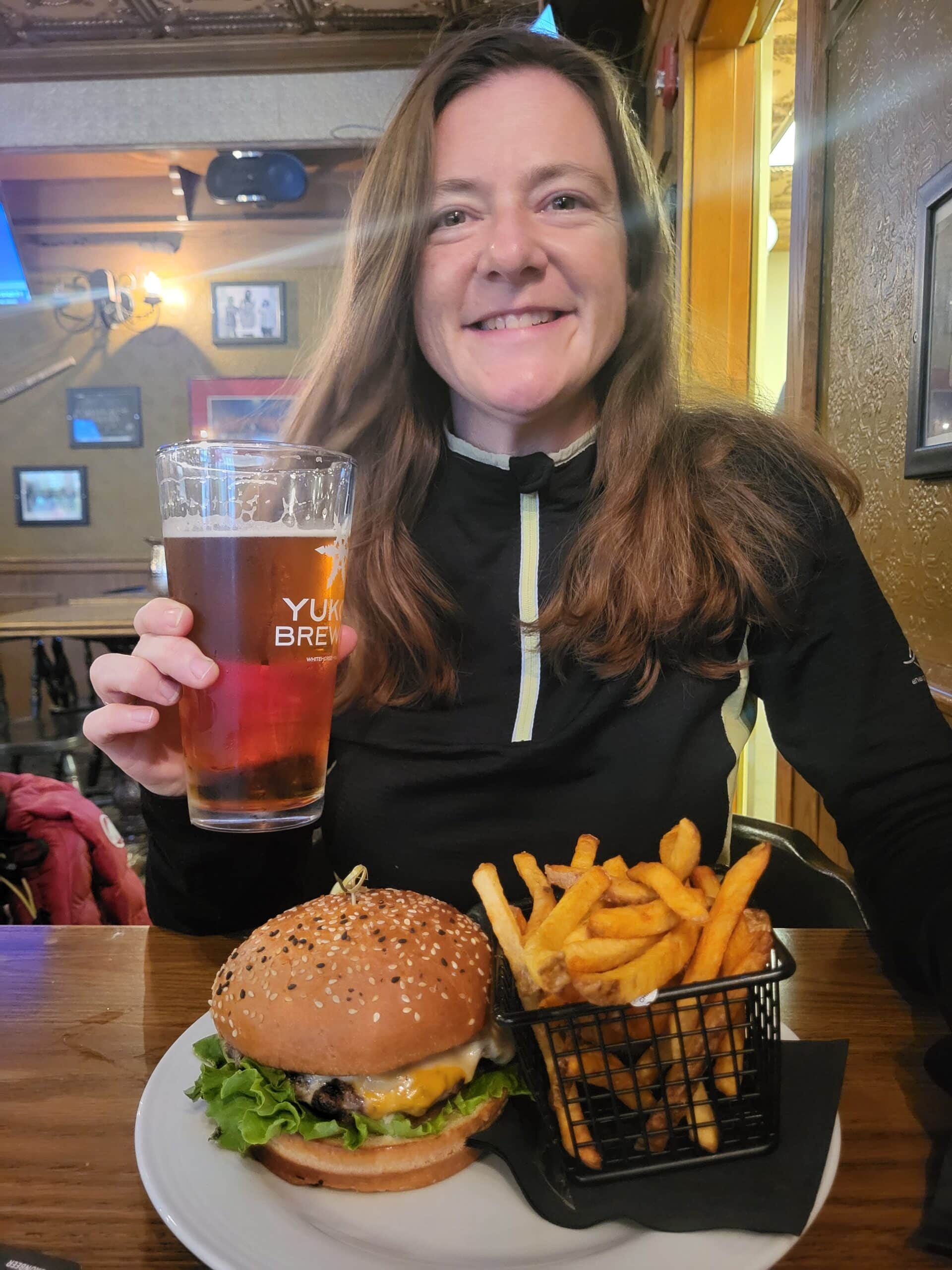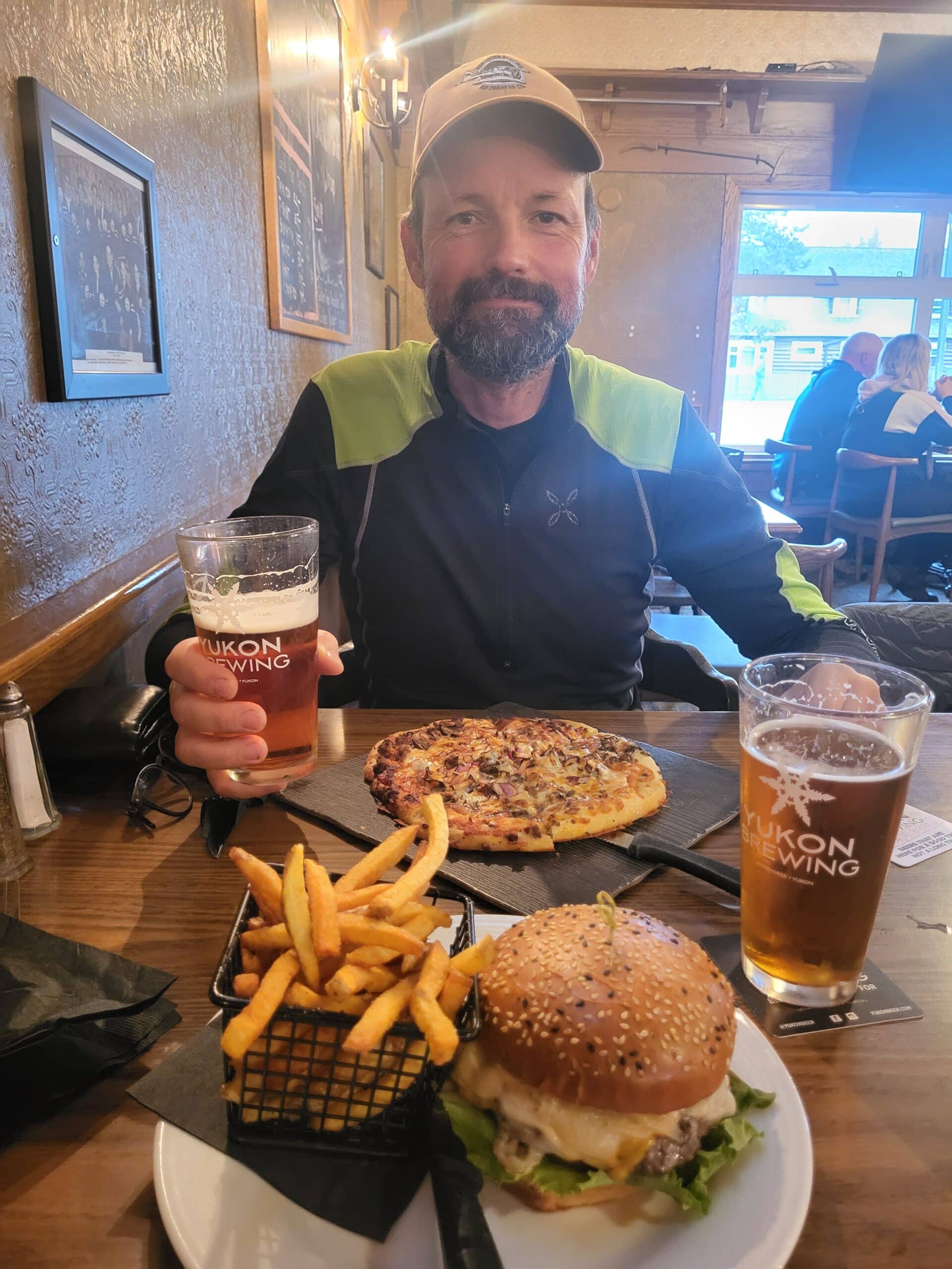 Für diese Tasks hätten wir eigentlich den ganzen Tag Zeit eingeplant. Nach der Flug-Odysee musste aber ein halber reichen. Und wieder war es eine Punktlandung. Um 18:02 Uhr (statt 18 Uhr) warteten wir vor dem Hotel auf Tom und seine Partnerin Angela, um gemeinsam Abendessen zu gehen. Wir sassen bei für Yukon-Verhältnisse Hitzetemperaturen von 25 Grad herrlich gemütlich draussen und liessen uns das letzte Mal für lange Zeit bedienen. Als uns langsam, aber sicher die Augen zuzufallen drohten (mittlerweile war es in der Schweiz 4 Uhr früh am Montag Morgen – also seit 48 Stunden mehr oder weniger auf den Beinen!), verabschiedeten wir uns von Angela und Tom und machten uns endlich, endlich auf den Weg ins Bett. Eine kurze Dusche später waren wir unter den Daunen einkuschelt und innert Sekunden eingeschlafen.