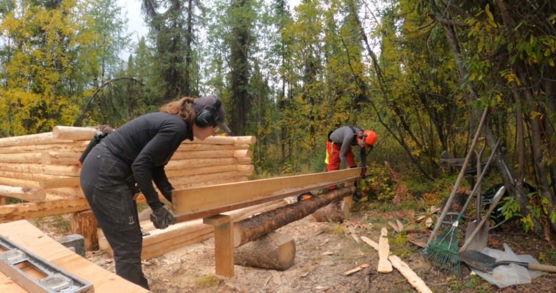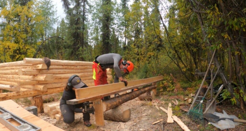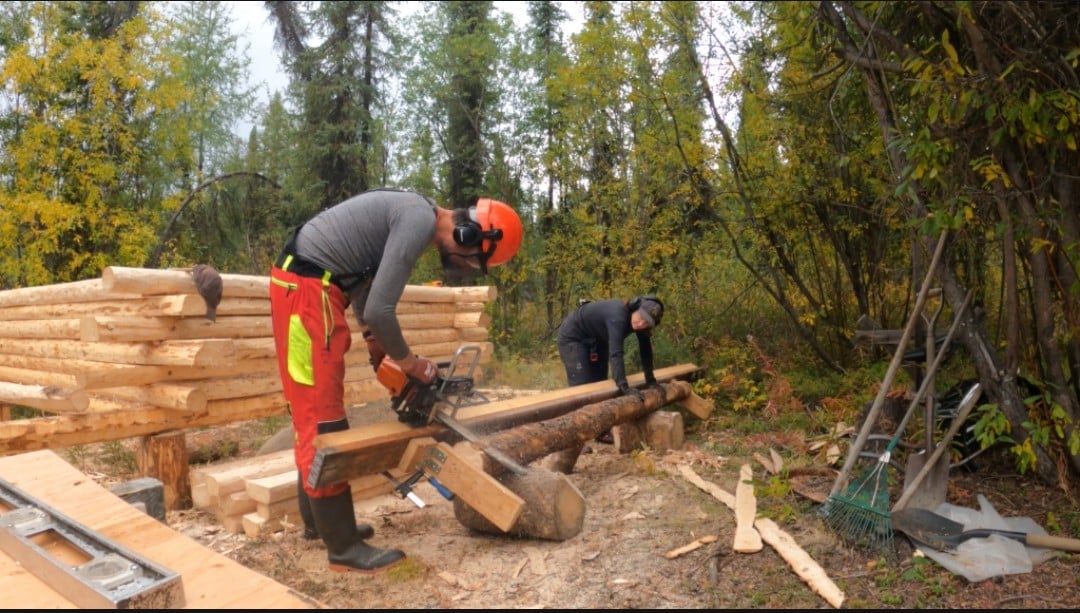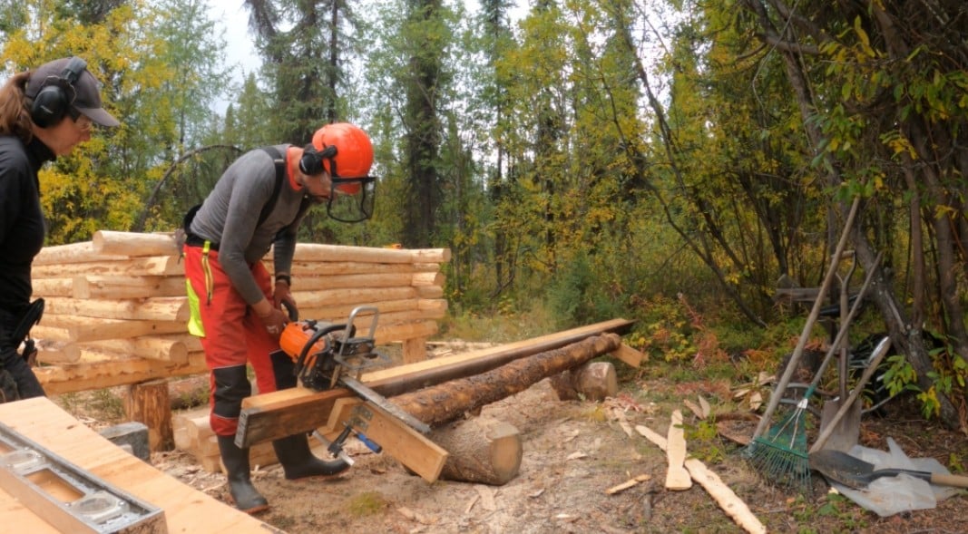 Nach dem Essen machten wir einen Spaziergang über ihr Grundstück. Sie besitzen ca. 10 Acres (ca. 40’000 m2) und haben noch ein paar weitere Gebäude. In der nächsten Zeit wollen sie mit einem Neubau für das Wohnhaus beginnen. Dazu haben sie sogar ein Sägewerk und einen Traktor gekauft und schon viel Vorbereitungsarbeiten für das benötigte Holz gemacht. Das Sägewerk ist ein supertolles Gerät – wir wünschten, wir hätten auch so was für den Saunabau gehabt! Aber die abenteuerliche Geschichte, wie der Traktor auf einem dafür gebauten Floss die 30 km See und den Landgang danach überstanden hat, brachte uns wieder auf den Boden der Tatsachen zurück, in welcher abgelegenen Wildnis wir uns hier befinden. Man vergisst leicht, dass man viele, viele Kilometer ausserhalb der Zivilisation und fern vom Strassennetz ist.