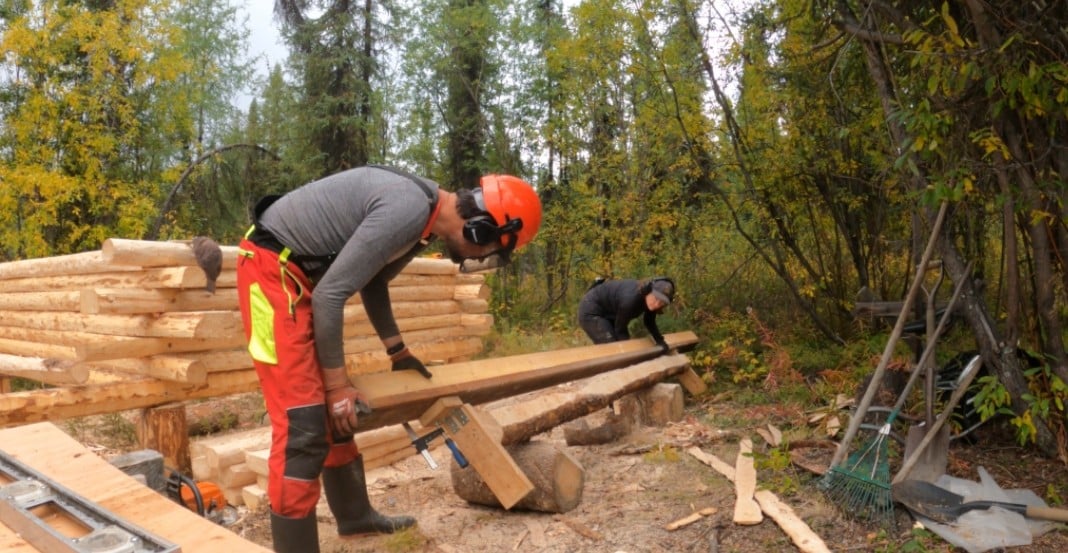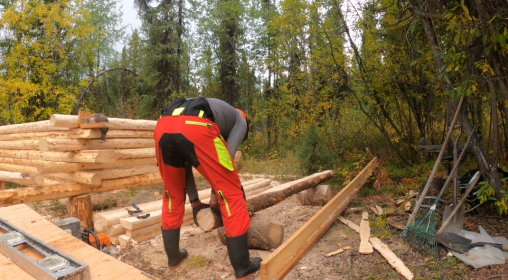 Am nächsten Morgen wussten wir nicht recht, ob es nun sehr tief hängende Wolken oder einfach nur Nebel ist. Auf jeden Fall sahen wir vom Schlafzimmerfenster nicht bis zum Ufer vom Rosie Lake – und das sind gerade mal 30 Meter. Wenigstens war es trocken, was das Arbeiten draussen auf jeden Fall erleichtert. Also zogen wir uns bald an (eine kleine Entspannrunde mit der grossen Kuscheldecke auf dem Sofa musste vorher aber noch sein) und nahmen die letzten Bäume für den Aufbau der Süd-, Ost- und Westseite in Angriff. Das waren immerhin noch 11 Stämme, die gefällt und 15, die entrindet werden mussten. Ausserdem brauchten wir noch 3 Dachbalken. Dass das etwas dickere und längere Stämme (auf 3.8 Meter geschnitten) sind, versteht sich von alleine. Wir suchten uns also das Passende im Wald aus und schleppten alle zum Bauplatz.